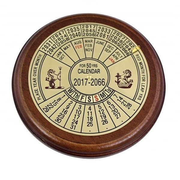 Луксозен календар за 50 години, изработен от месинг върху дървена основа.