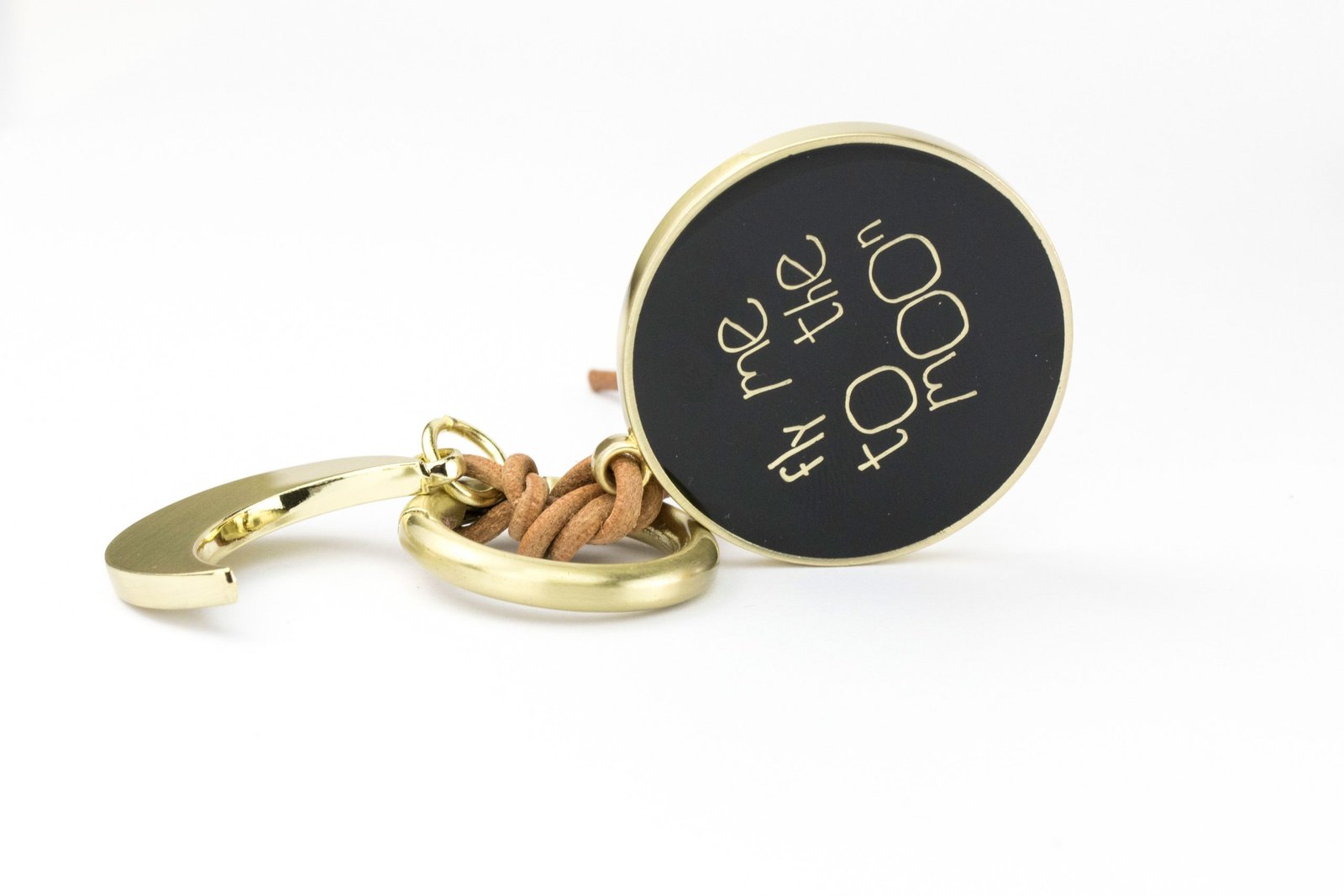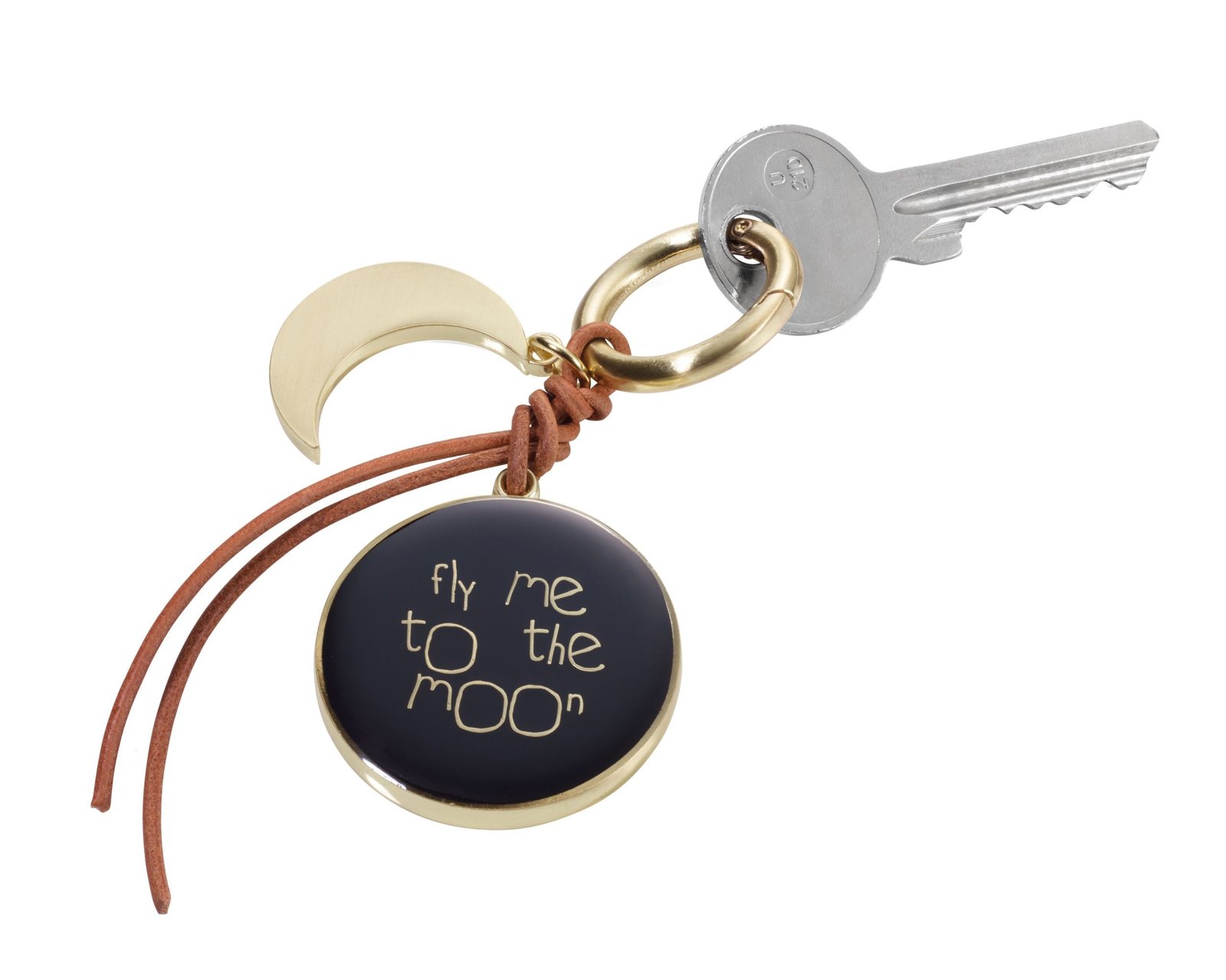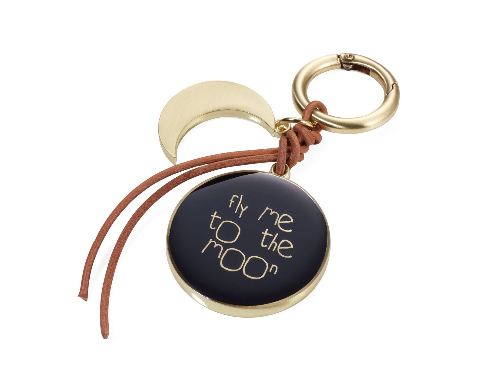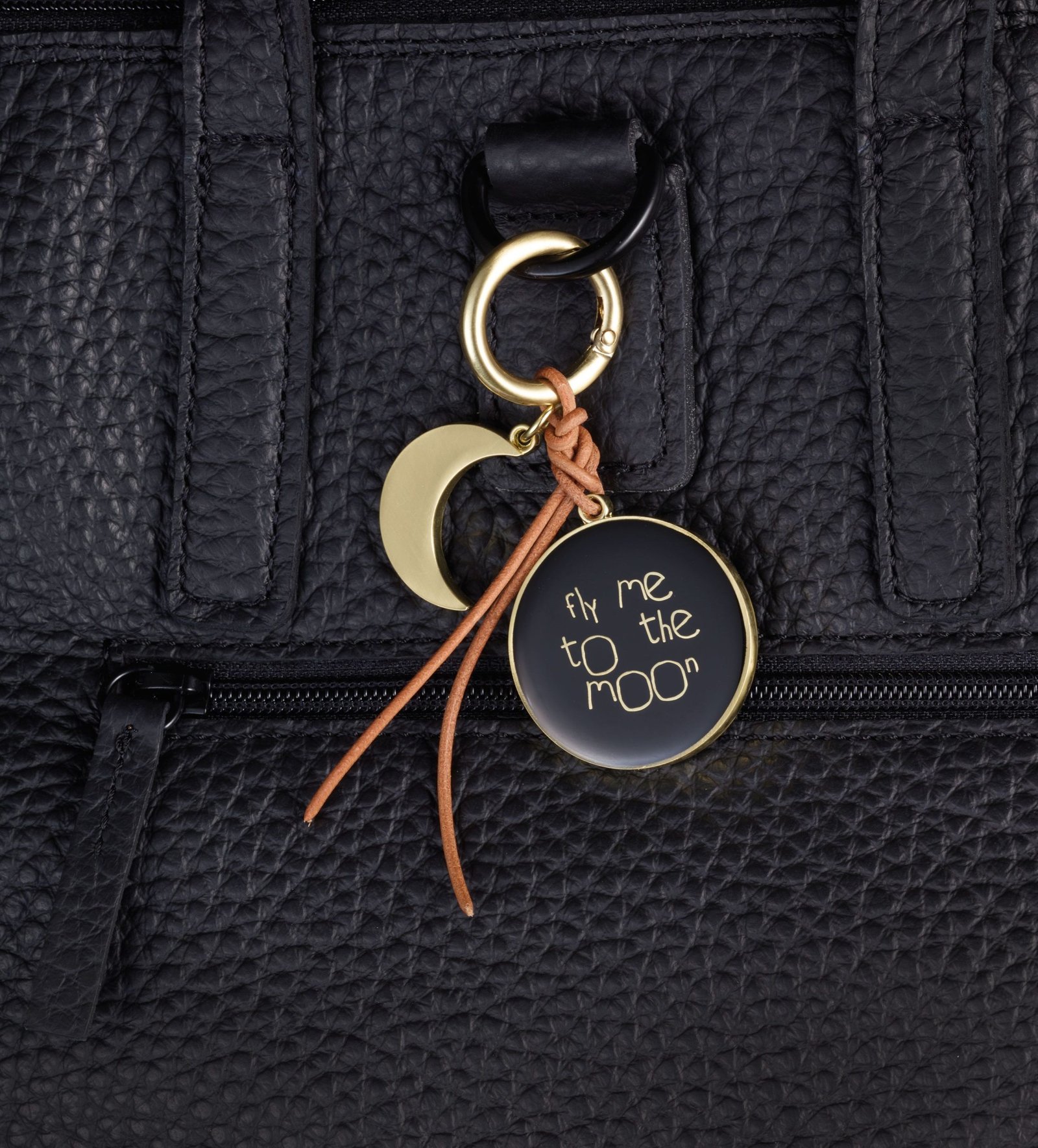 Моден аксесоар за дамска чанта с две украшения - полумесец и медальон с надпис "FLY ME TO THE MOON", карабинер, кожена връв, метал, покритие хром.