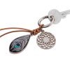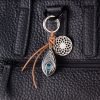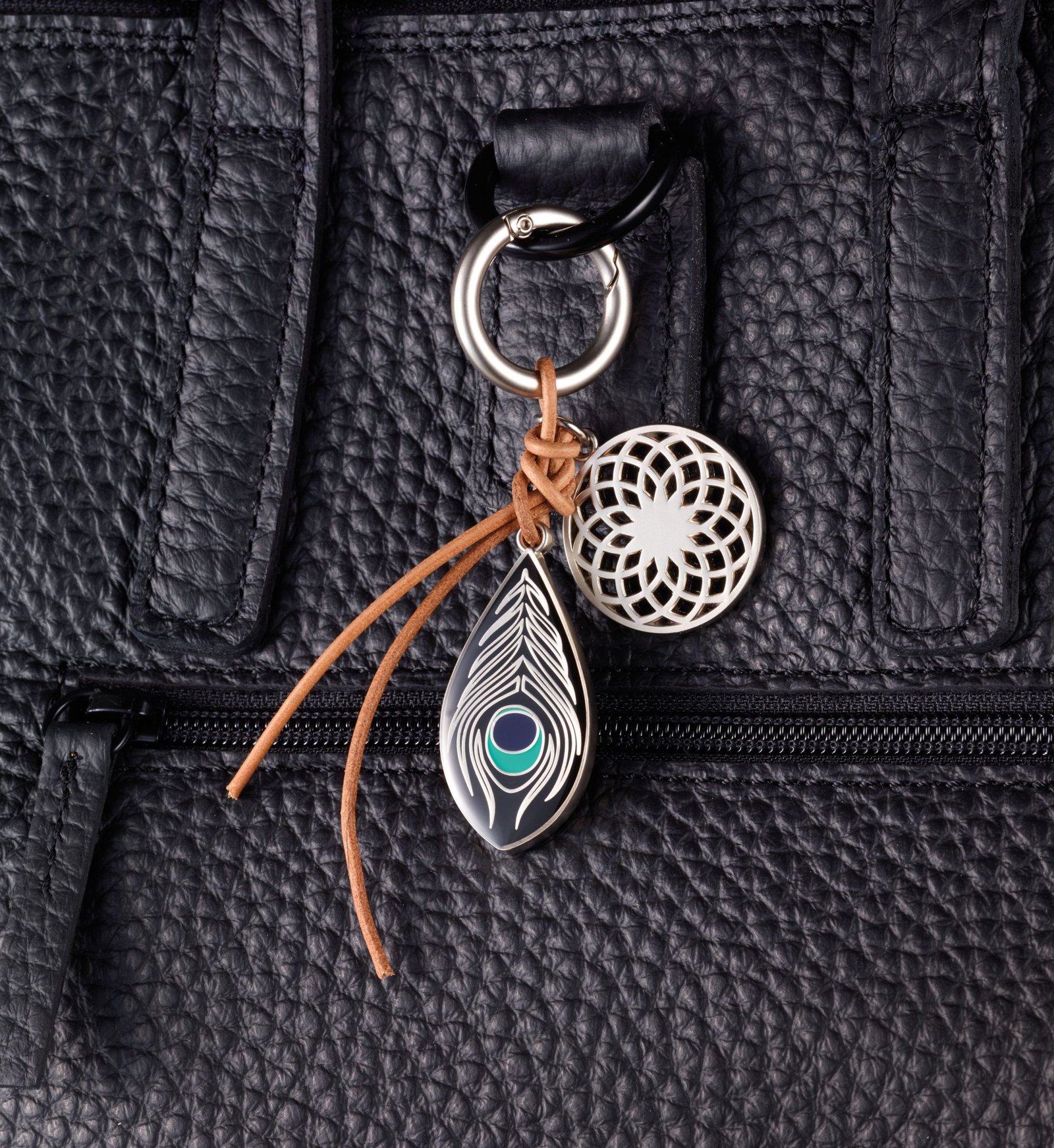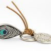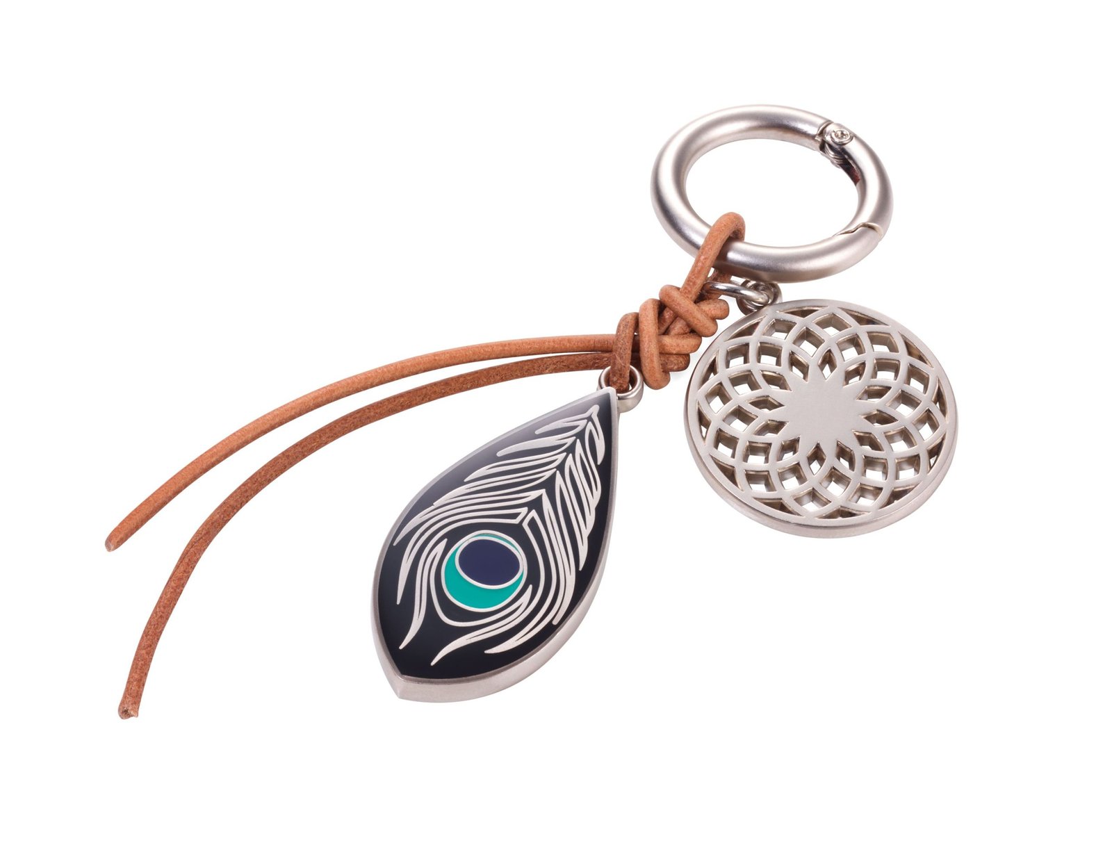 Моден аксесоар за дамска чанта с две украшения - пауново перо и ловец на сънища, карабинер, кожена връв, метал, покритие хром.