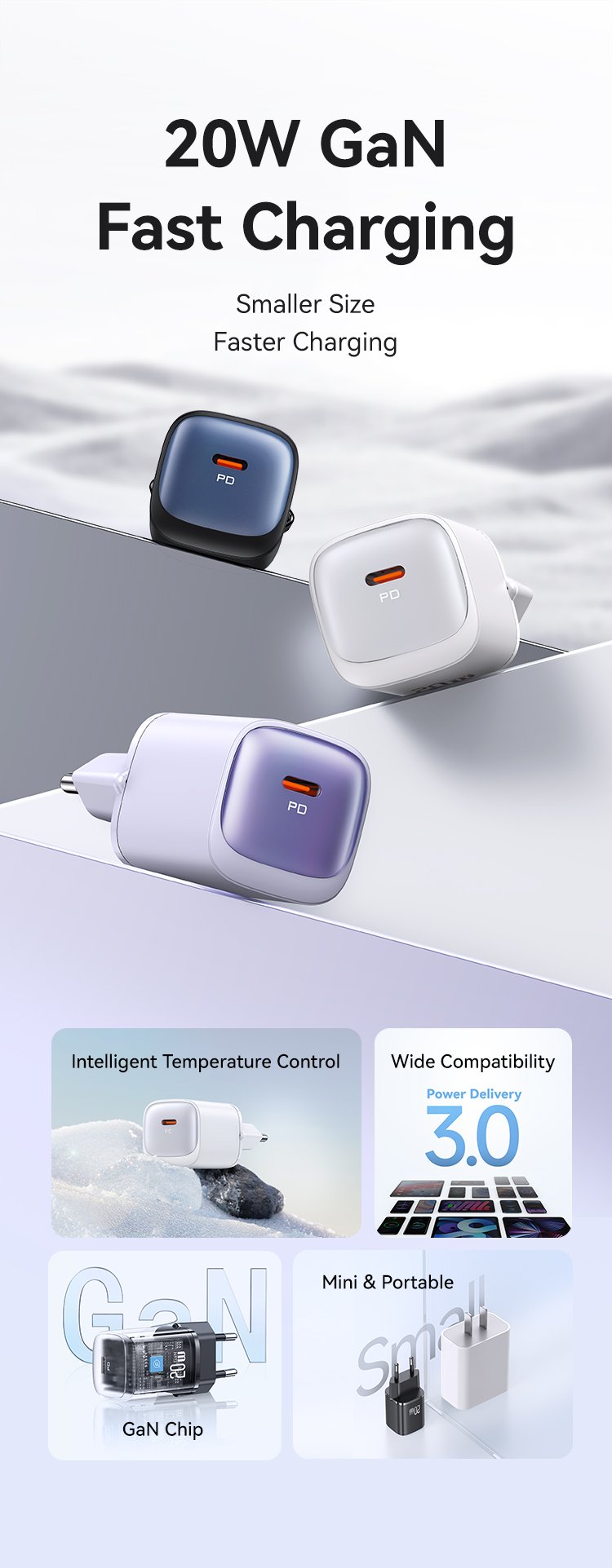 С малкия си размер и мощност от 20W, това зарядно устройство е лесно за пренасяне и удобно за ежедневна употреба. Идеално е за зареждане на смартфони, таблети и други устройства, дори когато сте в движение. - Технология GaN за по-ефективно зареждане