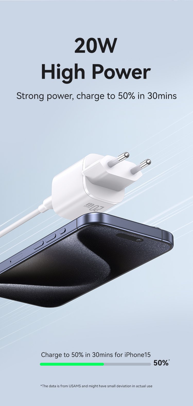 Usams 20W GaN Fast Charger комбинира висока производителност и компактен дизайн, което го прави идеалното решение за бързо и безопасно зареждане на вашите устройства. Зарядното устройство е оборудвано с иновативен GaN чип, който осигурява ефективност, надеждност и минимално загряване при работа.