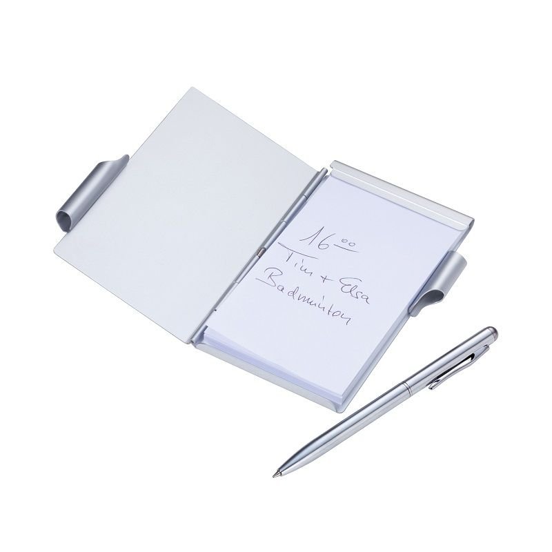 Метален калъф за бележник с бели старници (подменяеми). Към бележника е прикрепен и химикал с черно мастило. Корпус от алуминий.