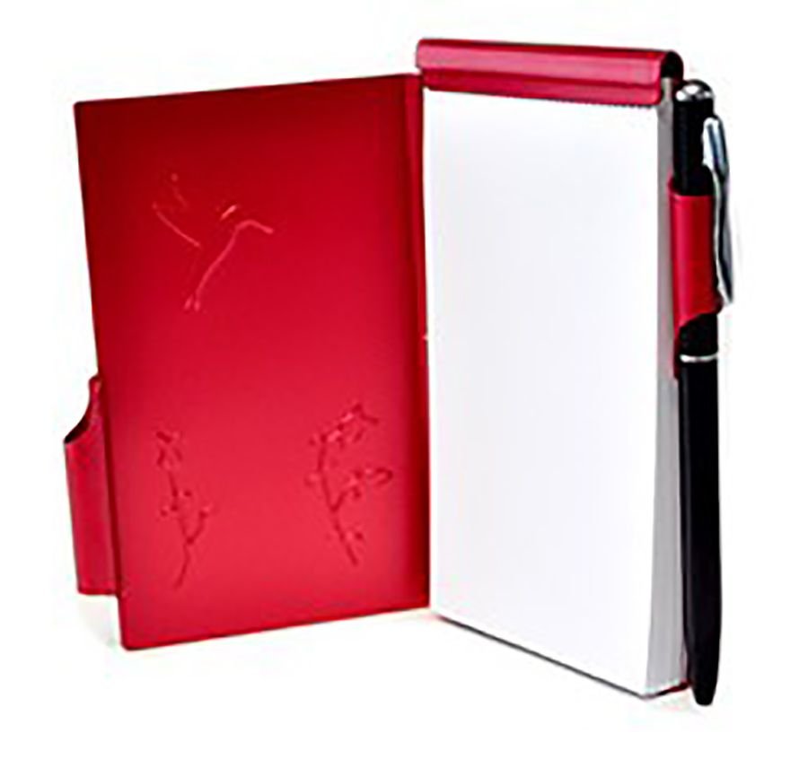 Метален калъф за бележник с бели старници (подменяеми). Към бележника е прикрепен и химикал с черно мастило. Корпус от алуминий.