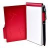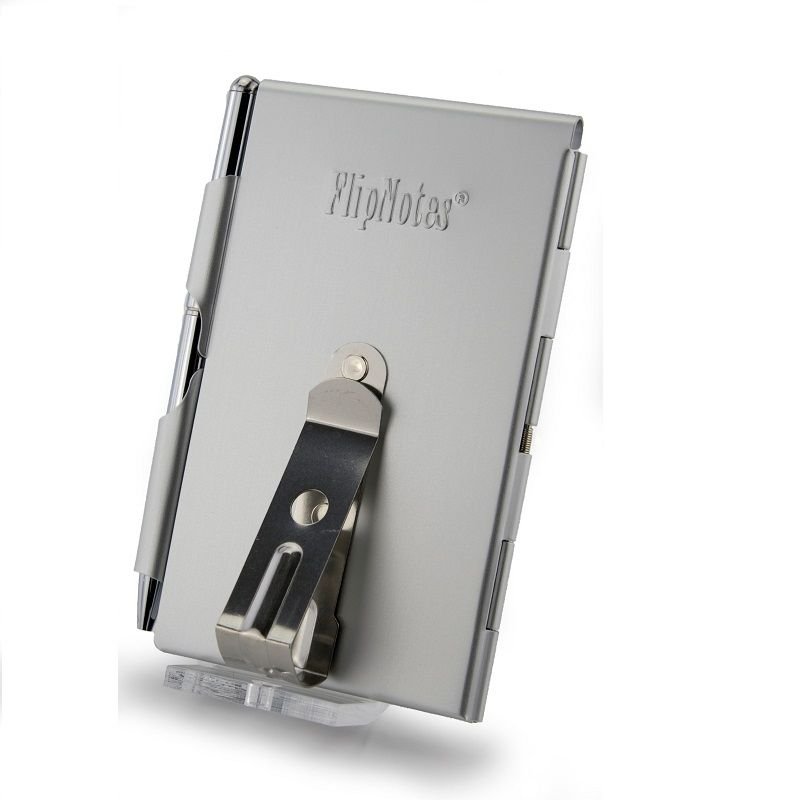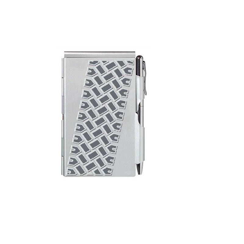 Метален калъф за бележник с бели старници (подменяеми). Към бележника е прикрепен и химикал с черно мастило. Корпус от алуминий.