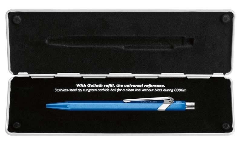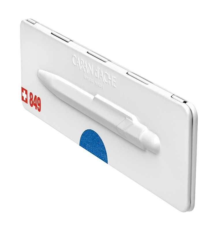 Автоматичната химикалка Caran d' Ache 849 Pop Line Collection е със синьо на цвят (с металически отблясък) и познатата и непроменена шестоъгълна форма на алуминиевото тяло, но в нови ярки и индивидуални цветове.