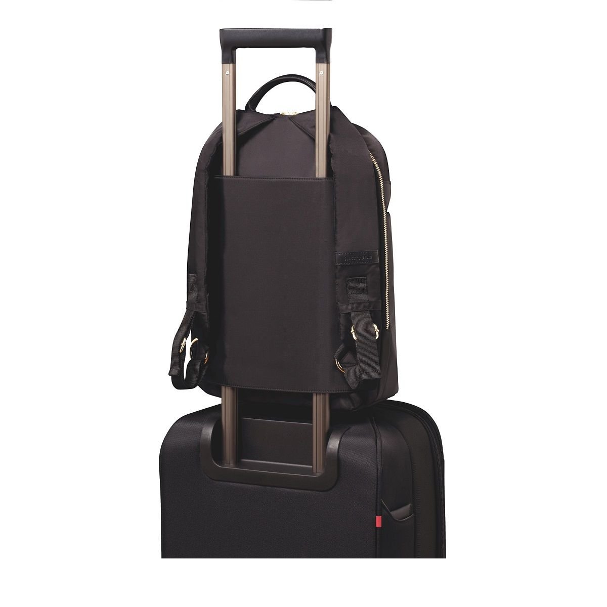 - Задния джоб се разкопчава и позволява закрепването на ръницата към дръжките на куфар с колела