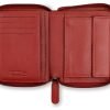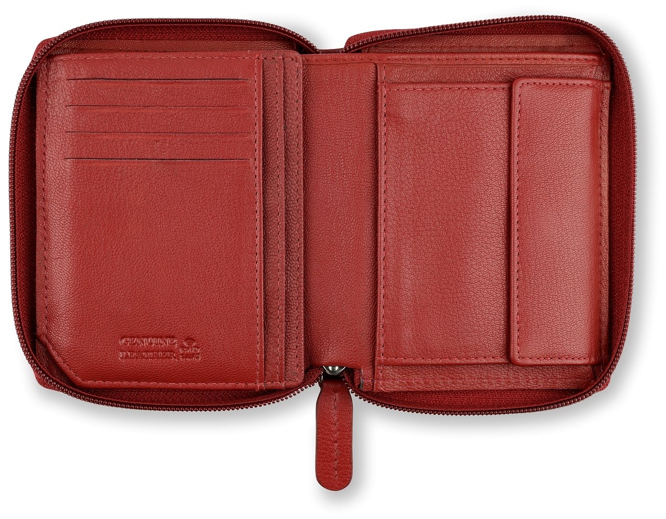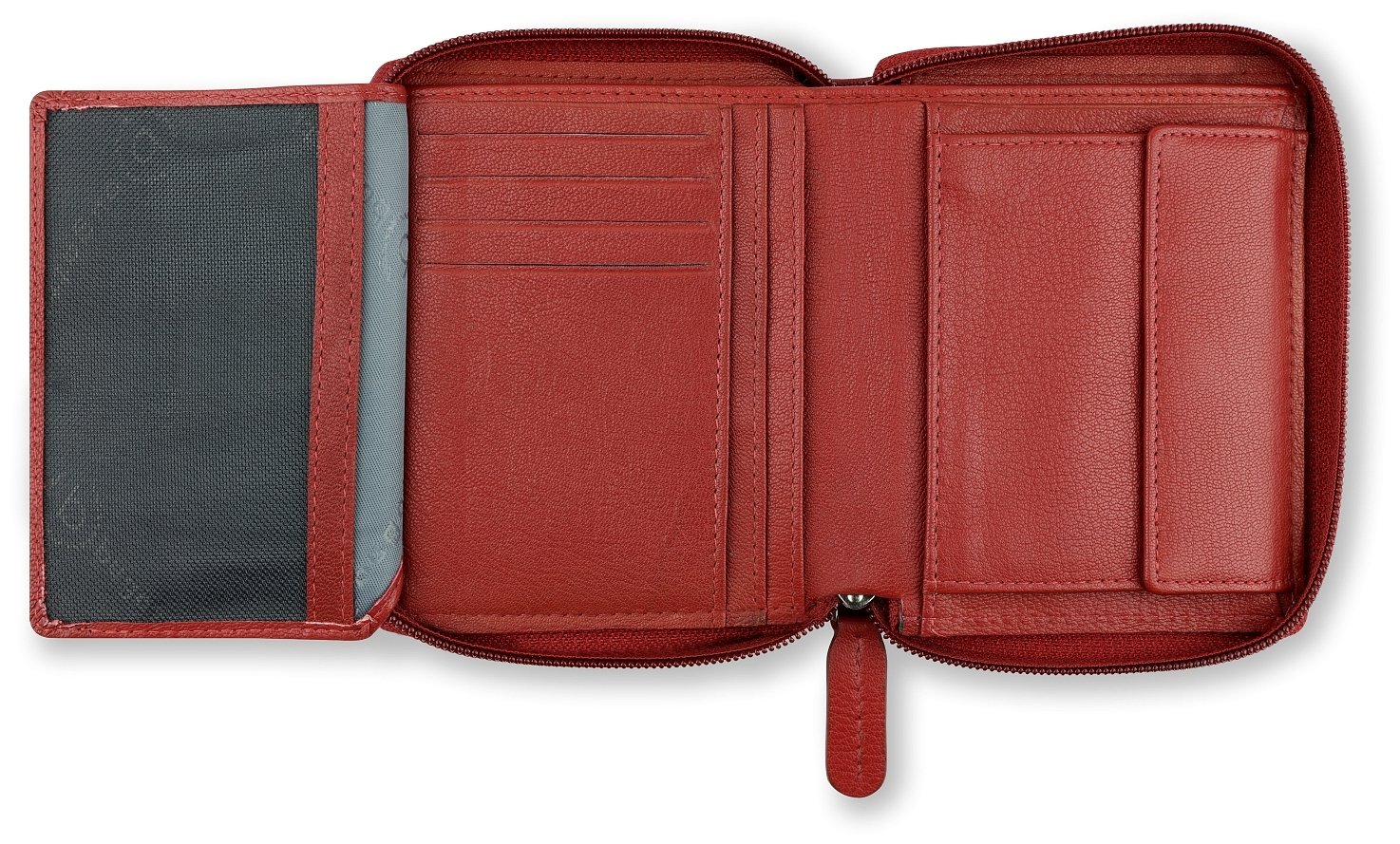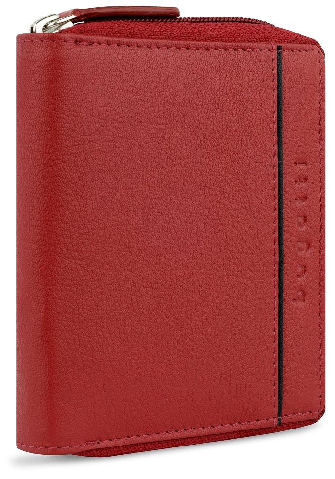 Кожен портфейл в червен цвят, предназначен за дамско използване. Портфейла разполага с множество отделения за съхраняване на карти, банкноти и монети. Вертикален портфейл с цип Bugatti Banda е обемен портфейл с перфектното вътрешно разпределние на отделенията. Разполага с две големи отделния за хартиени банкноти.