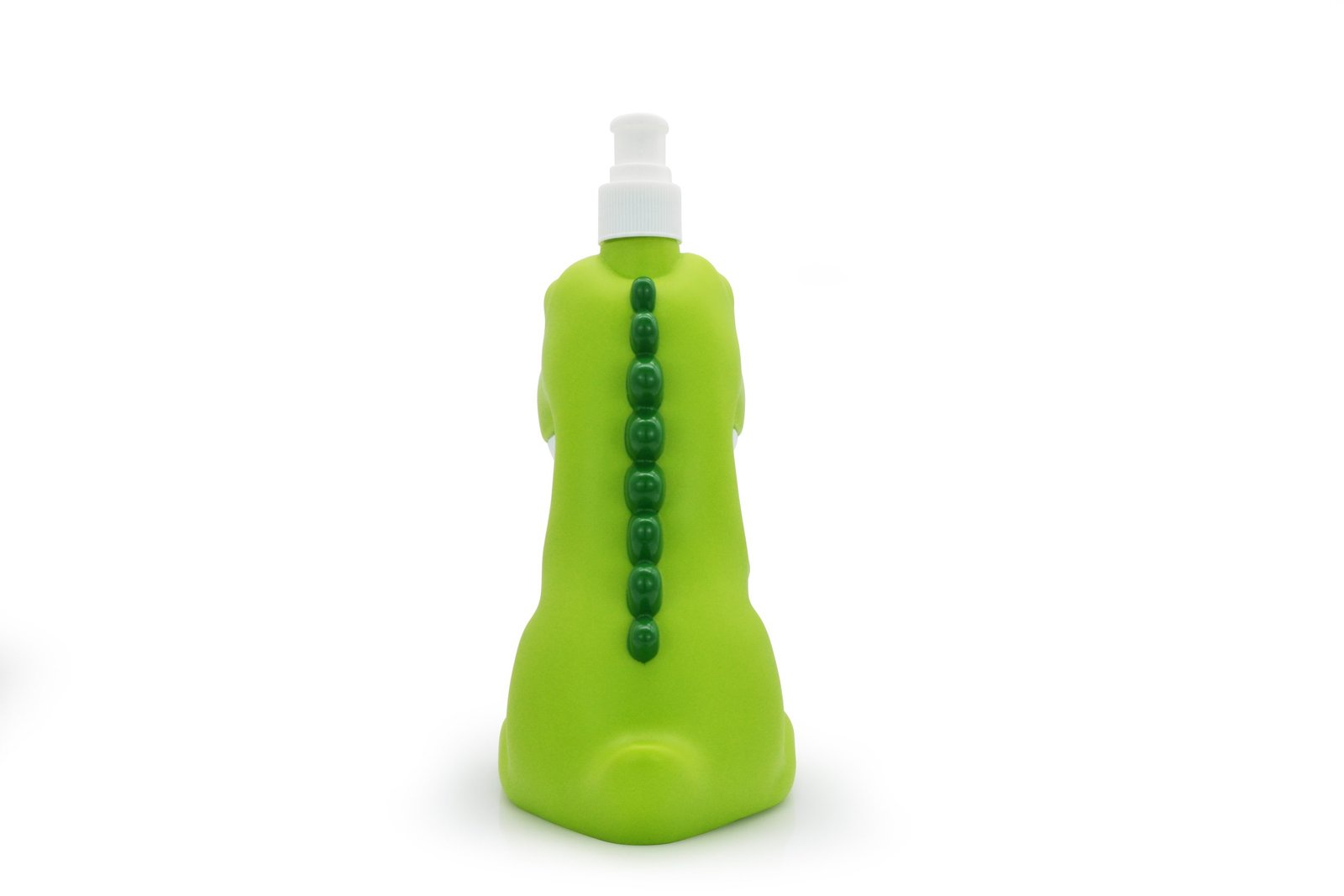Дозаторът представлява зелен динозавър, който допълнително е украсен с тъмнозелени шипове и черни очи, които му придават още по-забавен вид.