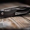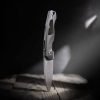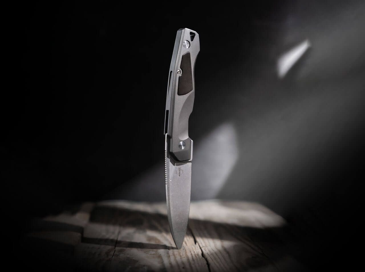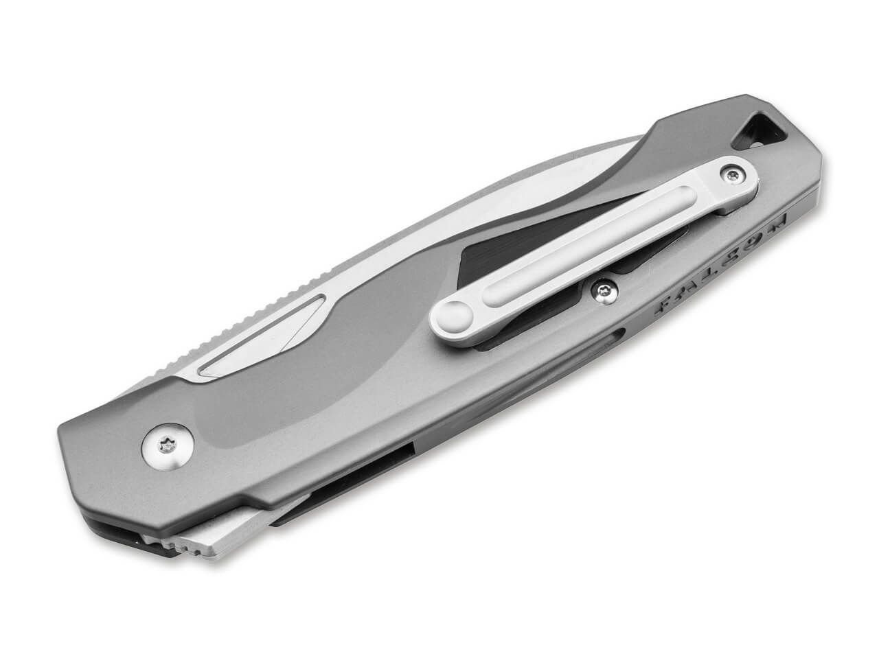 Джобният нож е снабден със сачмено лагерно острие със stonewash финиш, изработено от стомана D2 и се отваря лесно с флипер. За заключването се грижи стабилен linerlock механизъм, докато гофрите в областта на опората за палеца също повишават безопасността при работа. Сивото тяло на дръжката, изработено от триизмерно фрезован алуминий, е снабдено с ергономични вдлъбнатини за пръсти и инкрустация от благородно дърво. С декоративни винтове, отвор за ремък и фрезован клипс, който се демонтира.