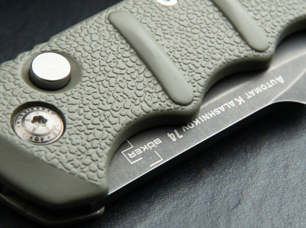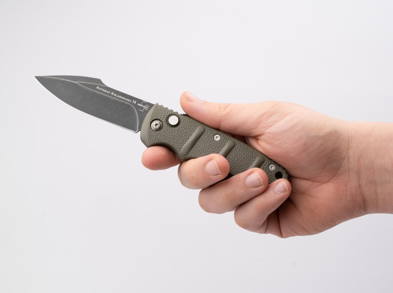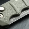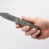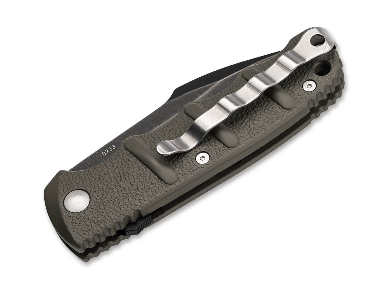 Дръжката е направена от лек и устойчив алуминий с фин завършек в OD Green цвят, който придава на ножа стилен и тактически вид. Дръжката осигурява стабилен захват, докато бутонът за заключване гарантира сигурността на острието при работа.