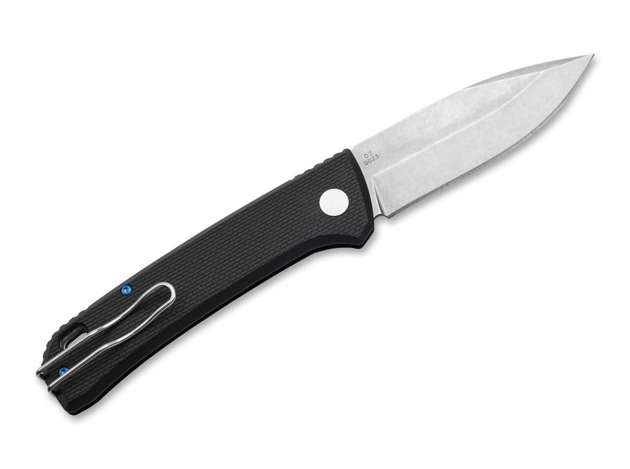 Острието на ножа, формирано във форма на капка, е изработено от висококачествена стомана D2, като се отваря с леко натискане на бутона и разполага със стонуош (stonewash) финиш, който не само придава изискан вид, но и допринася за неговата издръжливост и надеждност. Благодарение на този финиш, дори след интензивна употреба, малките следи от употреба практически изчезват.
