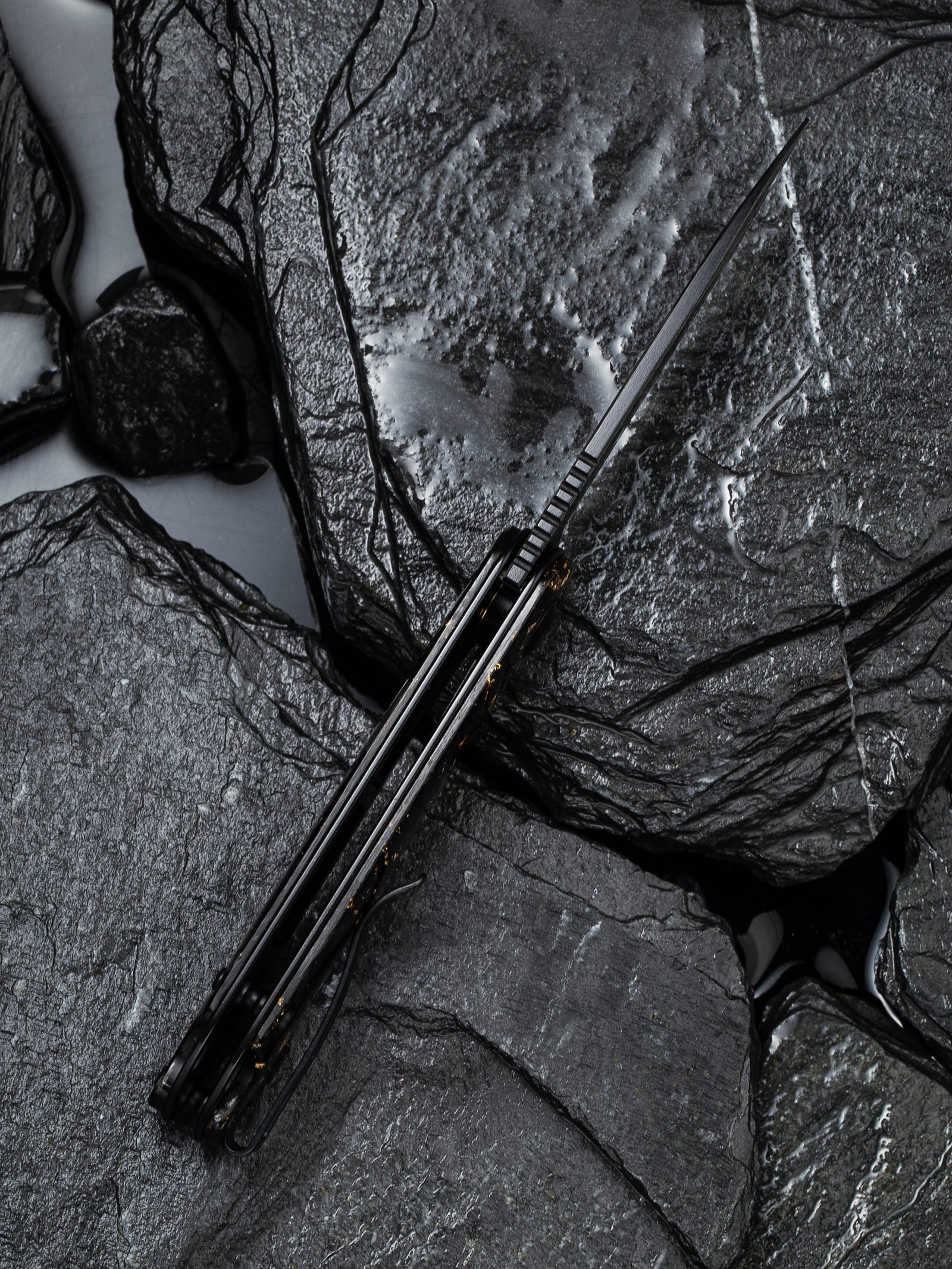 Материал на дръжката: Нарязани въглеродни влакна и златисти парченца в прозрачна смола
