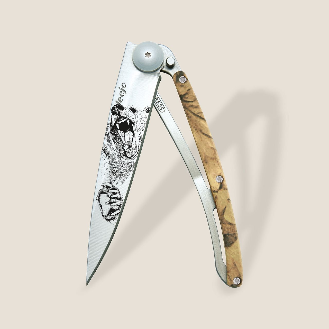 Ножът разполага с уникален кафяв камуфлажен дизайн, вдъхновен от природата, което го прави идеален за любителите на активния живот на открито. Дизайнът включва и елегантен мотив на гризли, който подчертава автентичността и силата на продукта.