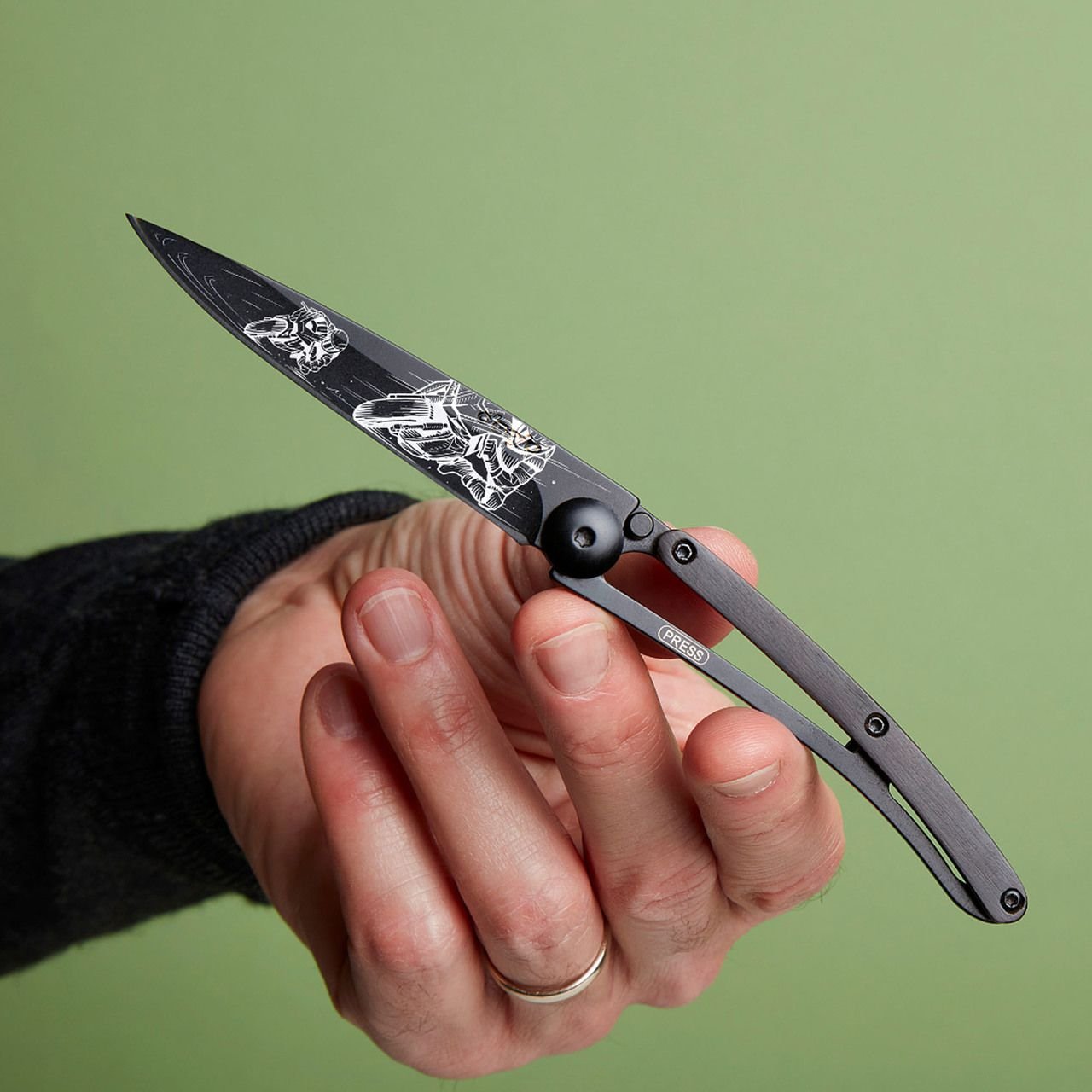 Този изключително лек нож, изработен от неръждаема стомана Z40C13 и облечен в черно титаниево покритие, предлага удобство и издръжливост, които са необходими за всякакви предизвикателства. Острието е оборудвано с лайнерлок система за заключване, украсено с фино лазерно гравиране, а клипсът за колан осигурява удобство при носене. Дръжката е изработена от абаносово дърво, което придава на ножа изискан вид и устойчивост на влага.