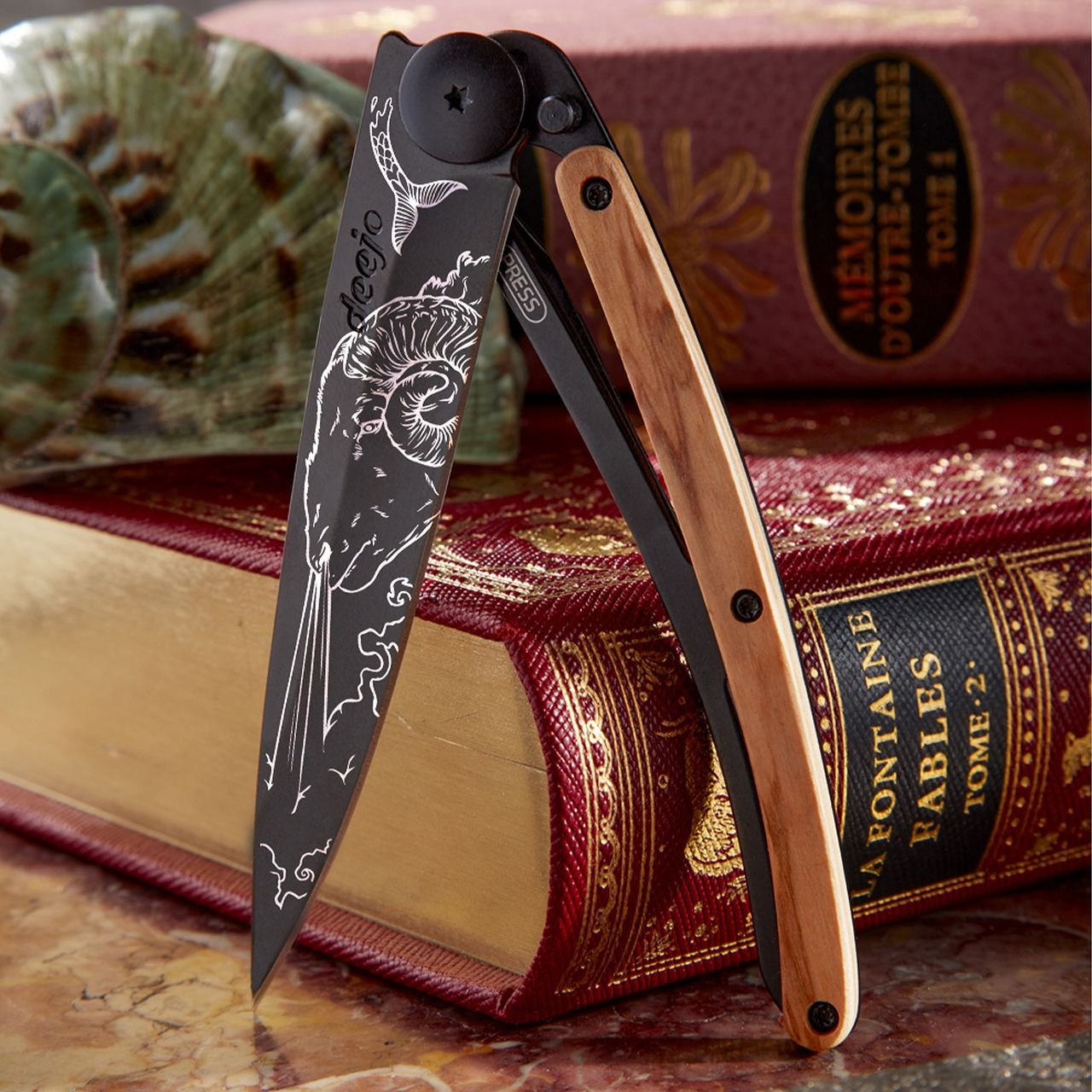 Джобният нож Deejo 37 г. в изпълнение с маслиново дърво и мотив Capricorn е перфектното съчетание от стил, издръжливост и функционалност. Този нож е проектиран с внимание към детайлите, предлагаща не само елегантен дизайн, но и висока практическа стойност, подходящ както за ежедневна употреба, така и за специални поводи.