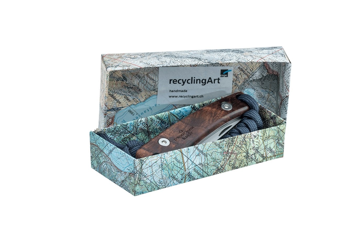 Вариантът с паракорд (парашутна корда) придава допълнителен стил и удобство. Този вариант се предлага в осем различни цвята, позволявайки ви да изберете този, който най-добре отговаря на вашия вкус и стил. Опаковката на ножа е не по-малко специална от самия продукт. Тя е изработена от стари карти, благодарение на Работилницата за рециклиране на Фондацията за подпомагане на затворници и освободени осъдени в Цюрих (www.zsge.ch). Тази уникална опаковка добавя допълнителна стойност и уникалност на ножа.