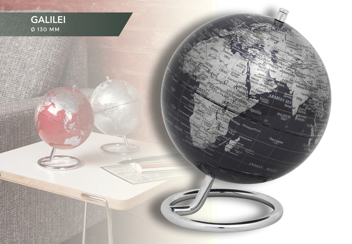 Атрактивен дизайн: Матов двуцветен глобус GALILEI (диаметър 13 см) със сребристи области на държавите и черни морета, надписани на английски език континенти, океани, държави, географски зони и важни градове.