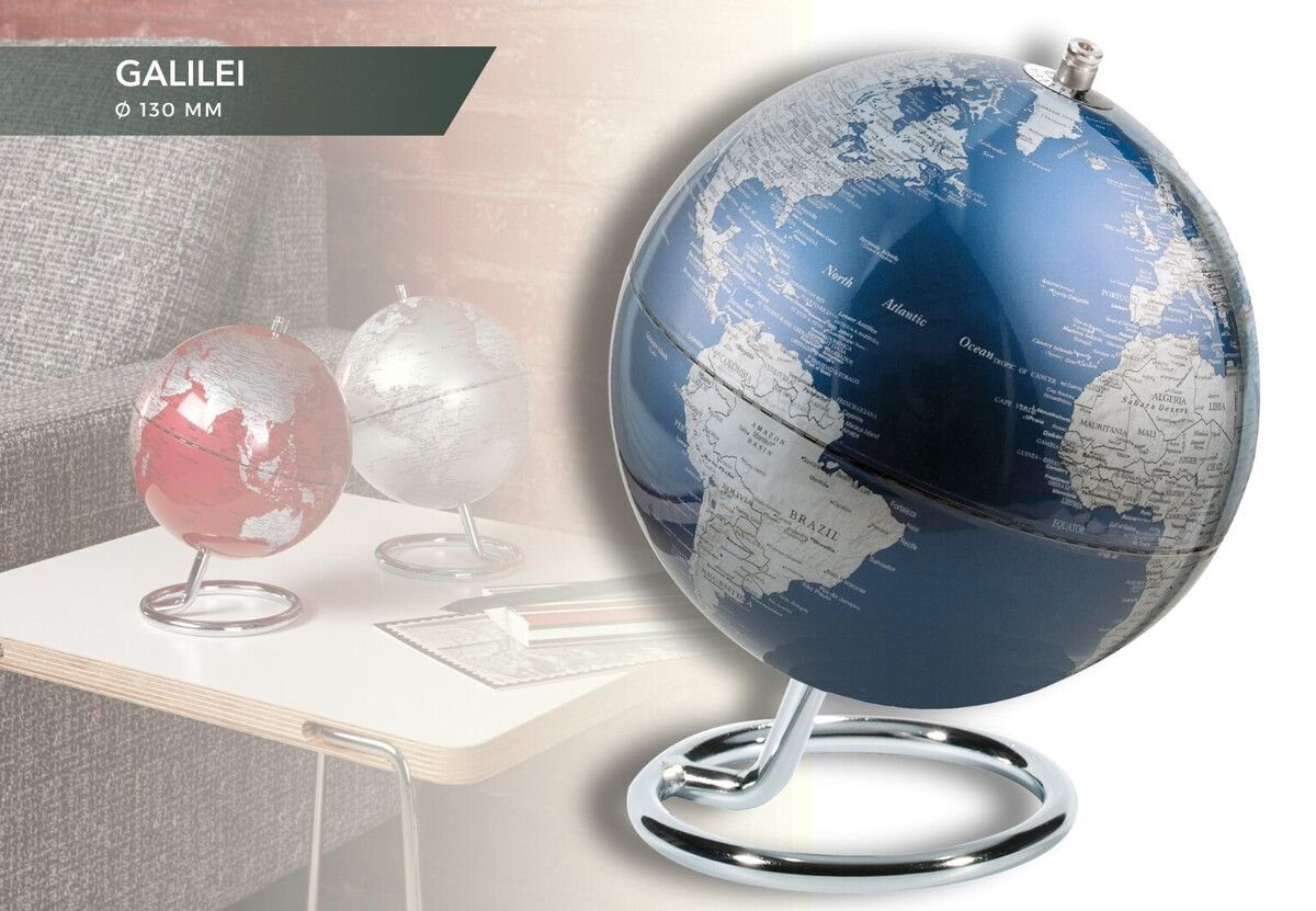 С диаметър от 13 см, GALILEI е с впечатляващ матов двуцветен дизайн, съчетаващ сребристи нюанси за континентите и металиково сини цветове за океаните и моретата. Всяка държава и географска зона са ясно обозначени с английски надписи, а важни градове са маркирани, което го прави не само красив, но и изключително практичен. Въртящата се ос на глобуса позволява лесно навигиране и разглеждане на различни части на света.