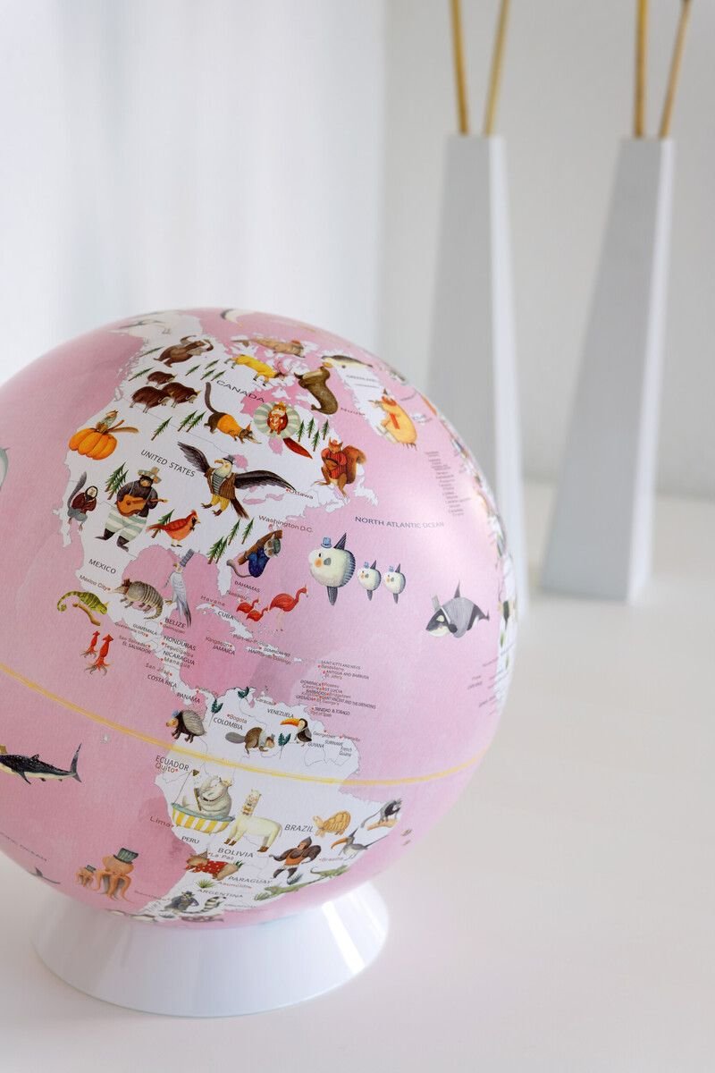 Розовият цвят на океаните и белите контури на държавите придават на глобуса едновременно модерен и игрив вид, който го прави привлекателен за децата. Континентите, държавите и географските зони са надписани на английски език, което улеснява запомнянето на имената на тези локации, докато се играе и учи.