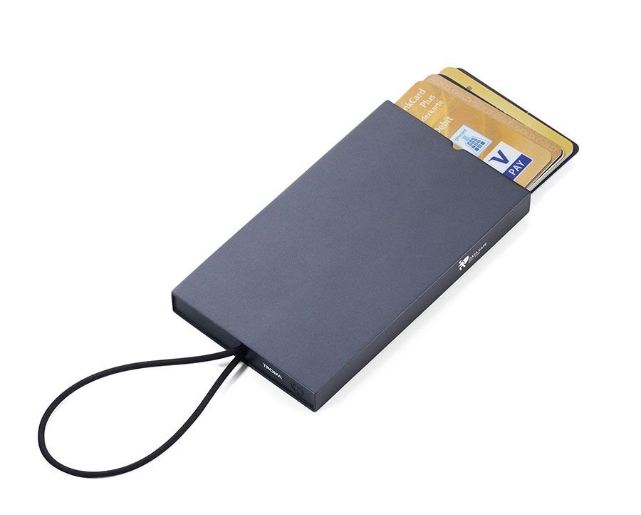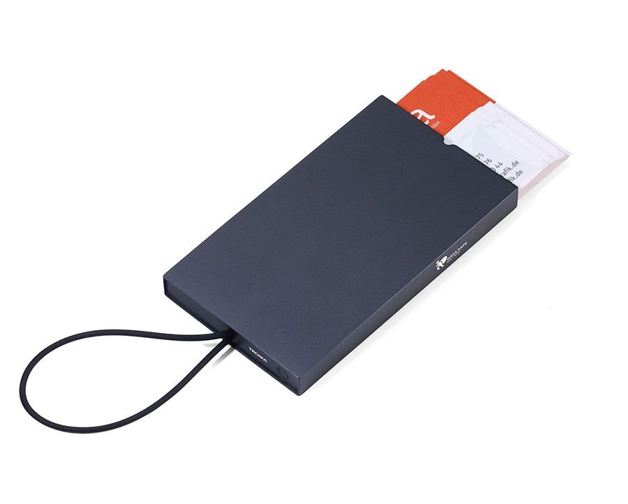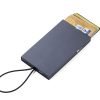 Калъф за кредитни карти с пружинен механизъм и закопчалка: гъвкава силиконова лента. Има RFID скиминг защита за кредитни, лични и други карти с RFID или NFC чип. Побира приблизително 9 карти.