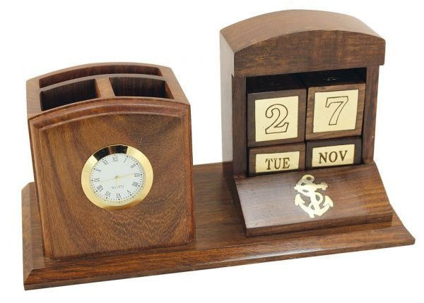 Календар с кубчета за датите, стойка за химикалки и часовник. Комлектът е изработен от месинг и дърво.