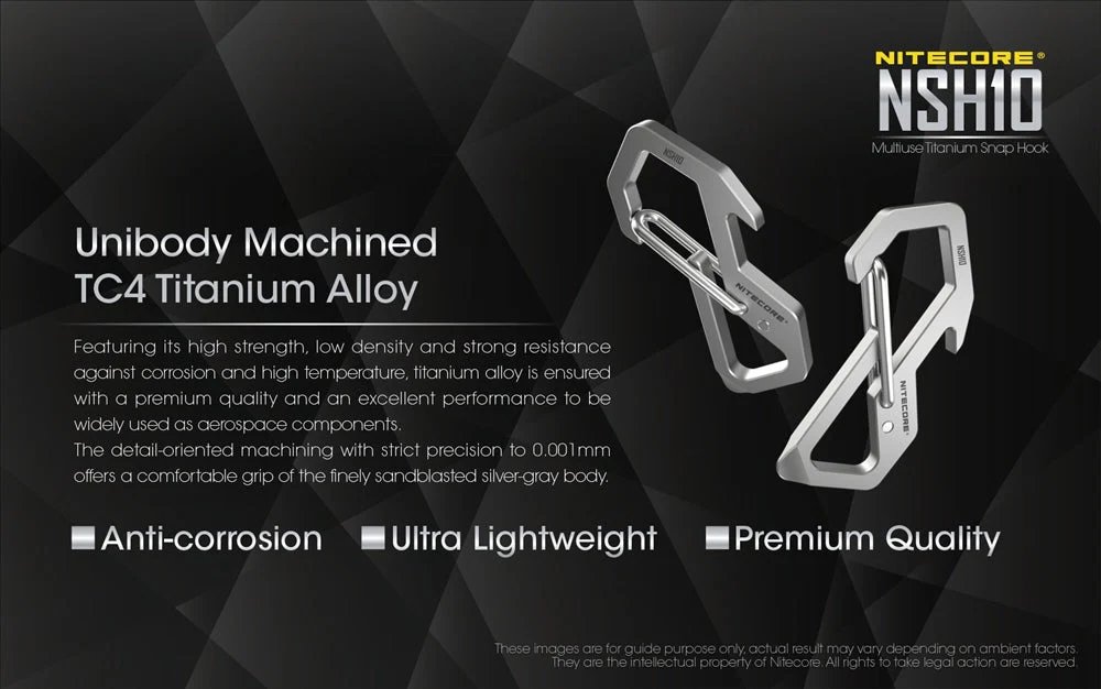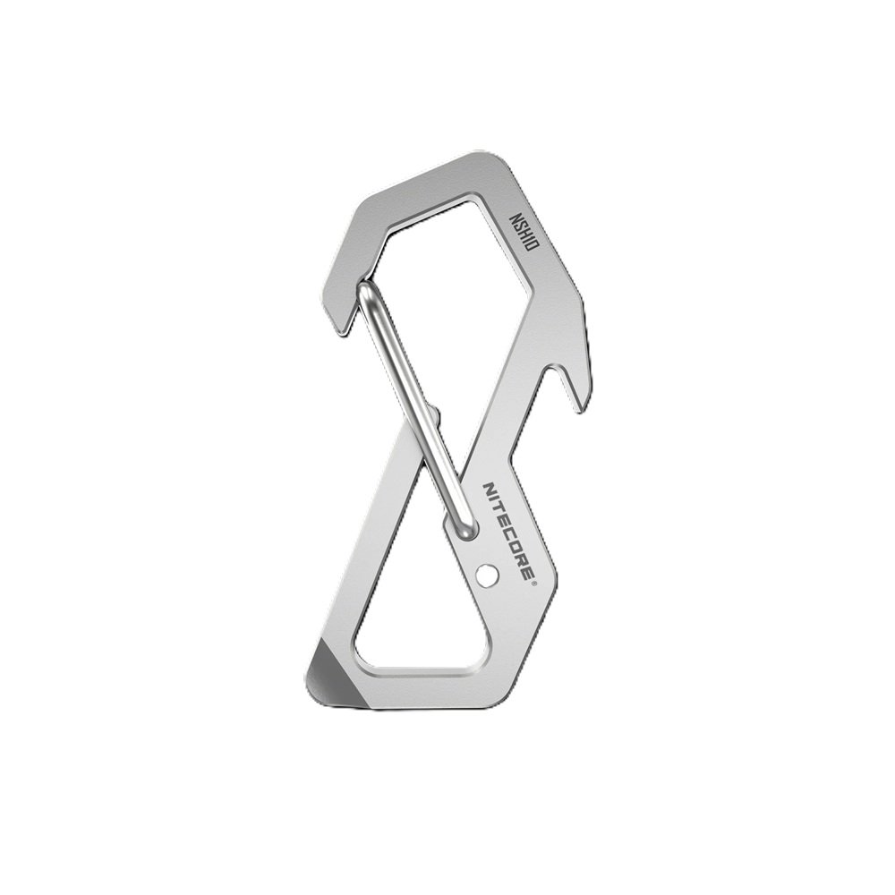 NITECORE NSH10 е многофункционална титаниева карабинер, изработен от машинно обработена титаниева сплав TC4. С високата си якост, ниска плътност и силна устойчивост на корозия и висока температура, титаниевата сплав гарантира първокласно качество и отлични характеристики, за да бъде широко използвана в аерокосмическите компоненти. Детайлно ориентираната обработка със строга прецизност до 0,001 мм предлага удобно захващане на фино пясъкоструеното сребристо-сиво тяло.