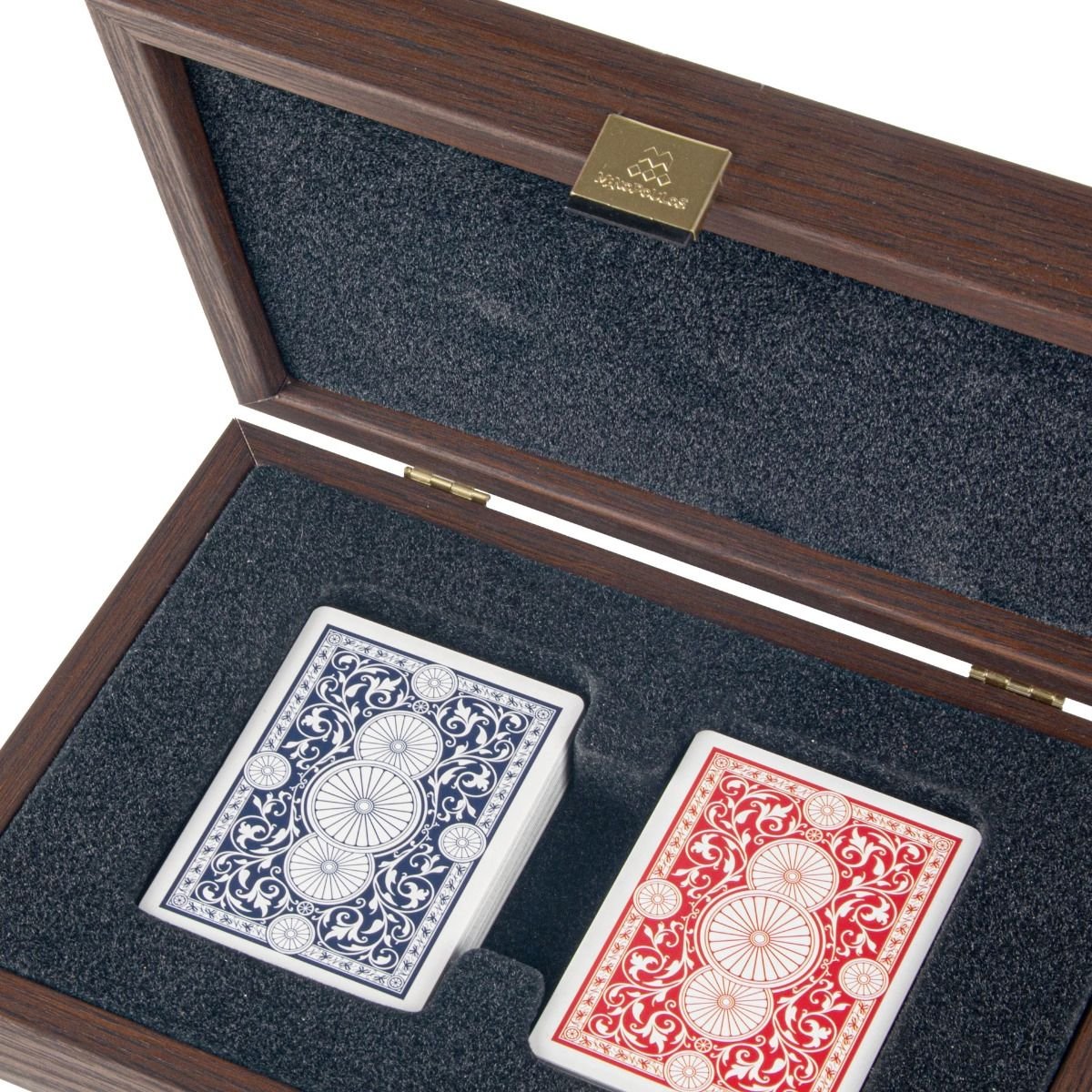 Кутията е изработена от дърво и има велурен интериор, придаващ уникално докосване и елегантност. В кутията са разположени две тестета от карти за игра в тъмносин и червен цвят с пластично покритие.