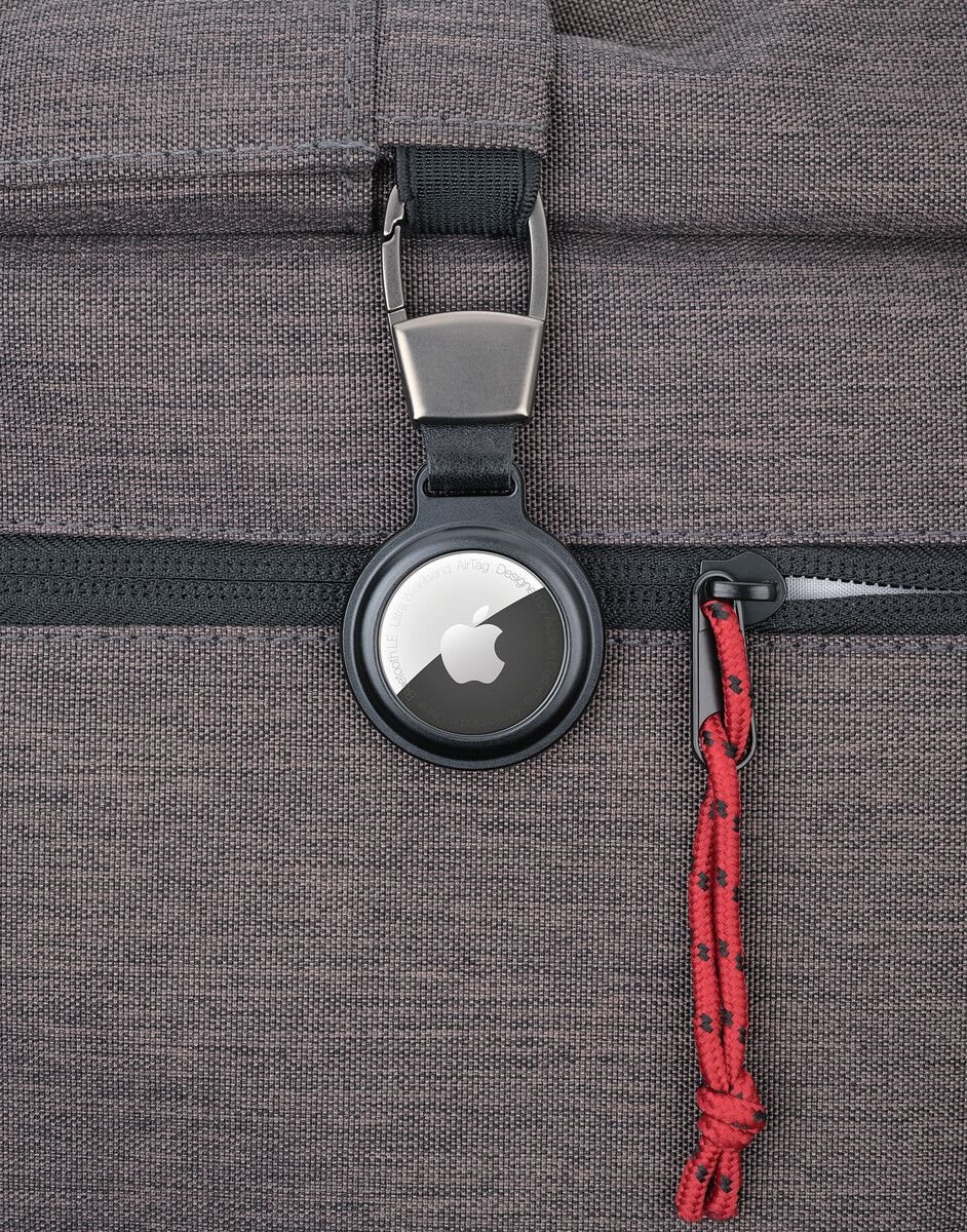 Ключодържател / защитен калъф за APPLE AirTag®, с карабинер за гъвкаво закрепване към: ключодържател, раница, чанта за лаптоп и др., изрез с магнитна закопчалка, алуминий, мат, черен