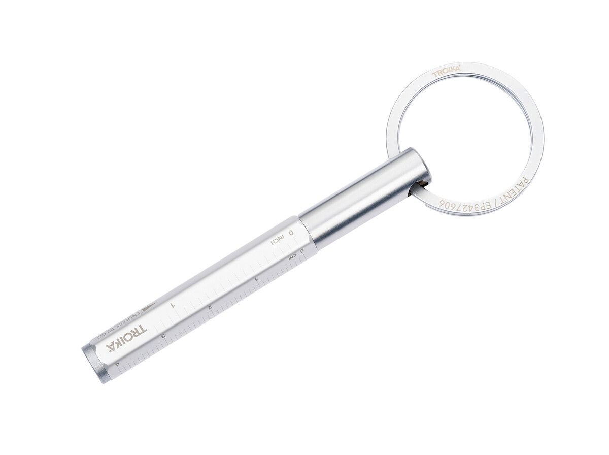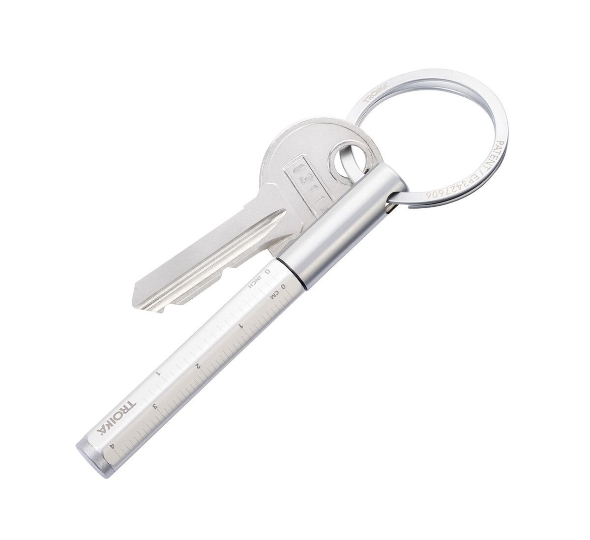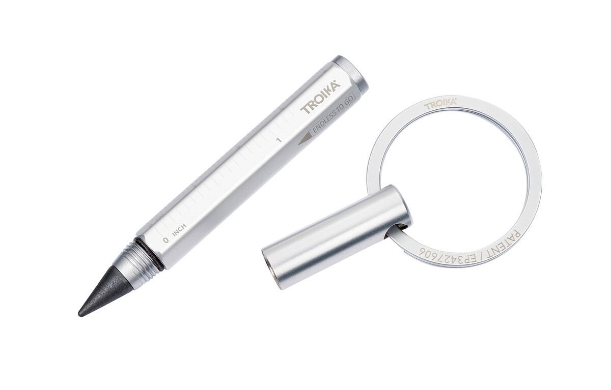 Многофункционален молив и ключодържател с вечнопишещ връх (приблизително 20 км дължина на писане), бързо и лесно закрепване на ключа благодарение на патентован механизъм за отваряне (TROIKA NAIL GUARD), сантиметрова/инчова линийка, HB, изтриваем, без необходимост от заточване, сменяем връх за писане , алуминий, мат, сребрист цвят