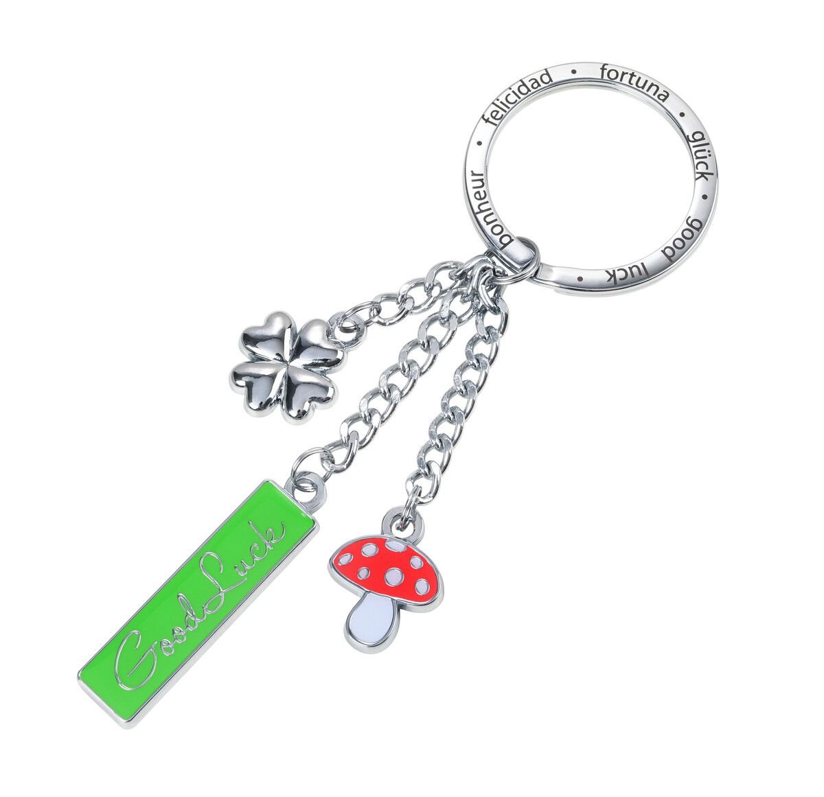 Трите завладяващи талисмана – класическата детелина, причудливата гъба и табелата „Добро утро“ – са сложно проектирани да привличат вниманието и да предизвикват радост във всеки поглед. Това, което отличава този ключодържател, е неговият XL пръстен, който осигурява достатъчно място за вашите ключове.