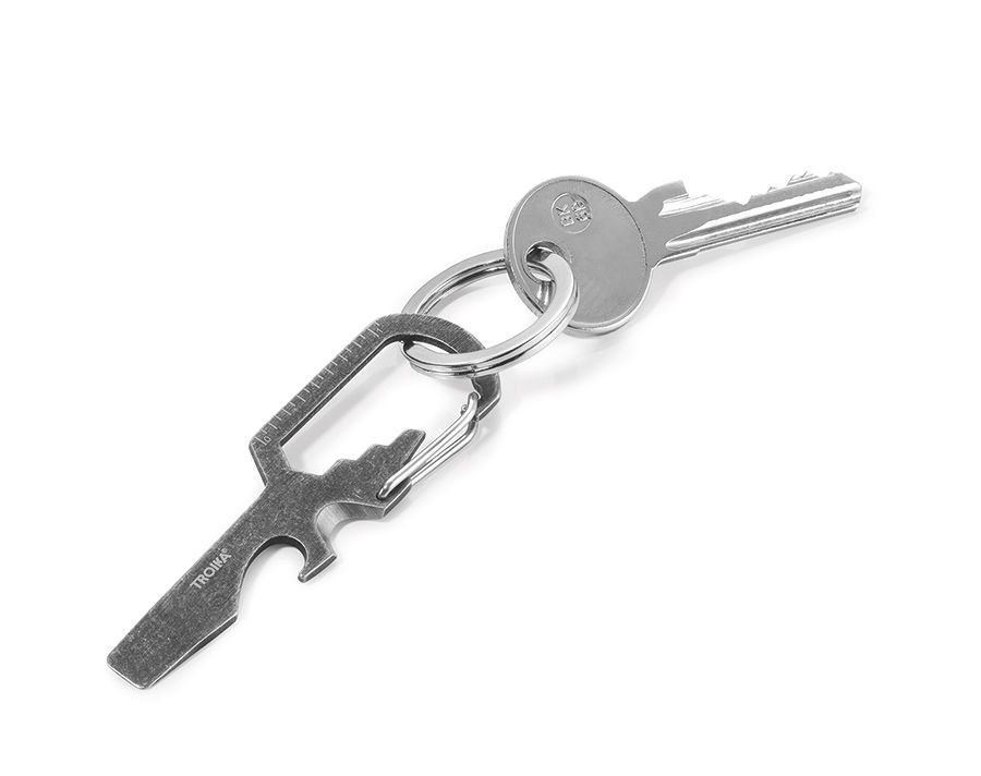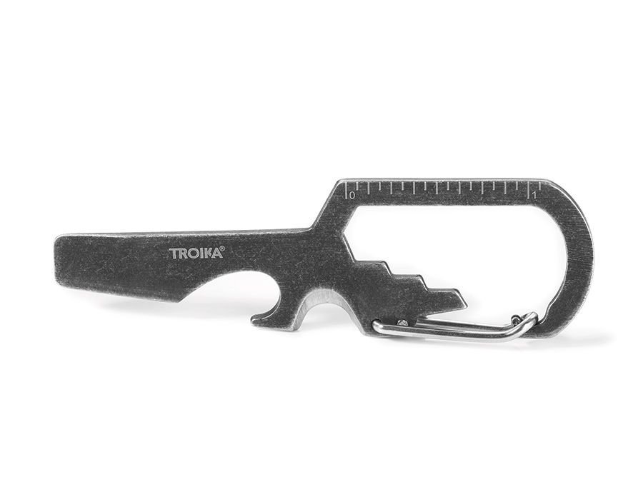 Ключодържател TROIKA, мини инструмент с 7 функции: ключодържател, отварачка за бутилки, плоска отвертка, заголване на кабели, карабинер, линийка (см и инч), гаечен ключ (3 размера), стомана (420), сив..