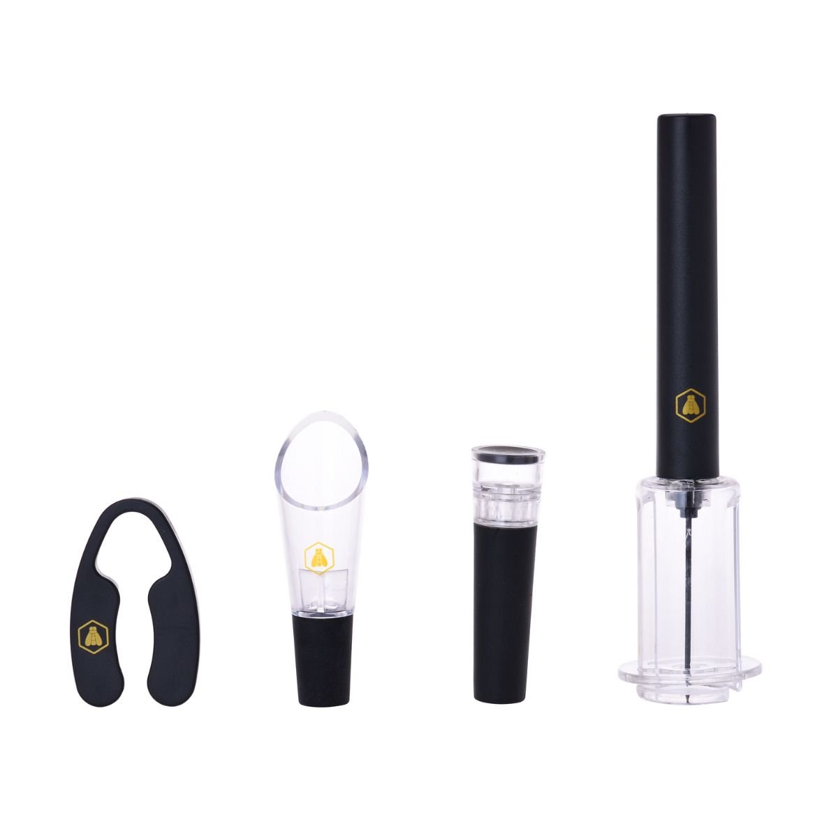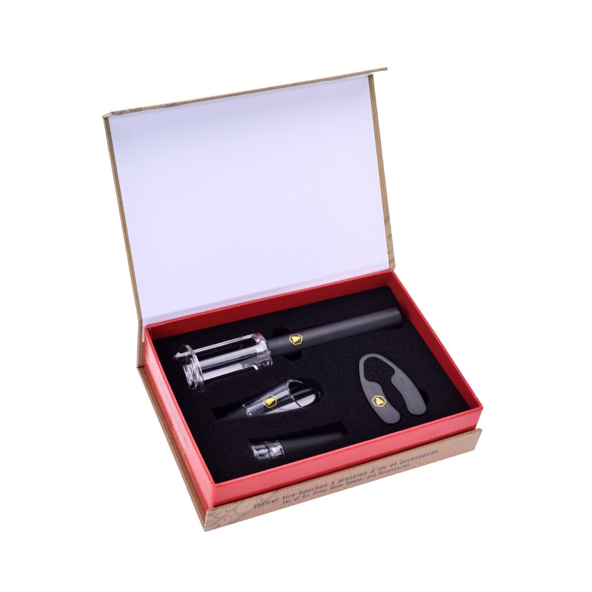 Комплект за вино Laguiole от четири части: пневматичен тирбушон, фолиорезачка, наливник и тапа.