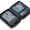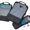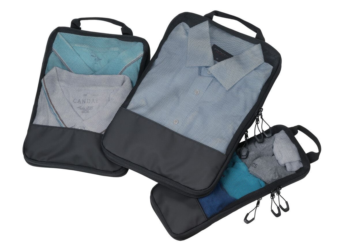 След като въздухът излезе между дрехите, ще имате повече място в куфара или раницата за други неща. Номерът: допълнителен цип за компресиране намалява обема само до една трета. Това спестява място и поддържа нещата организирани. Нищо не се мачка, нищо не се изплъзва, всичко лежи здраво и сигурно на мястото си. В три практични размера: L за ризи и панталони, M за ризи и S за чорапи и бельо. Всеки с мрежест прозорец и дръжка за носене, изработени от черен брезент.
