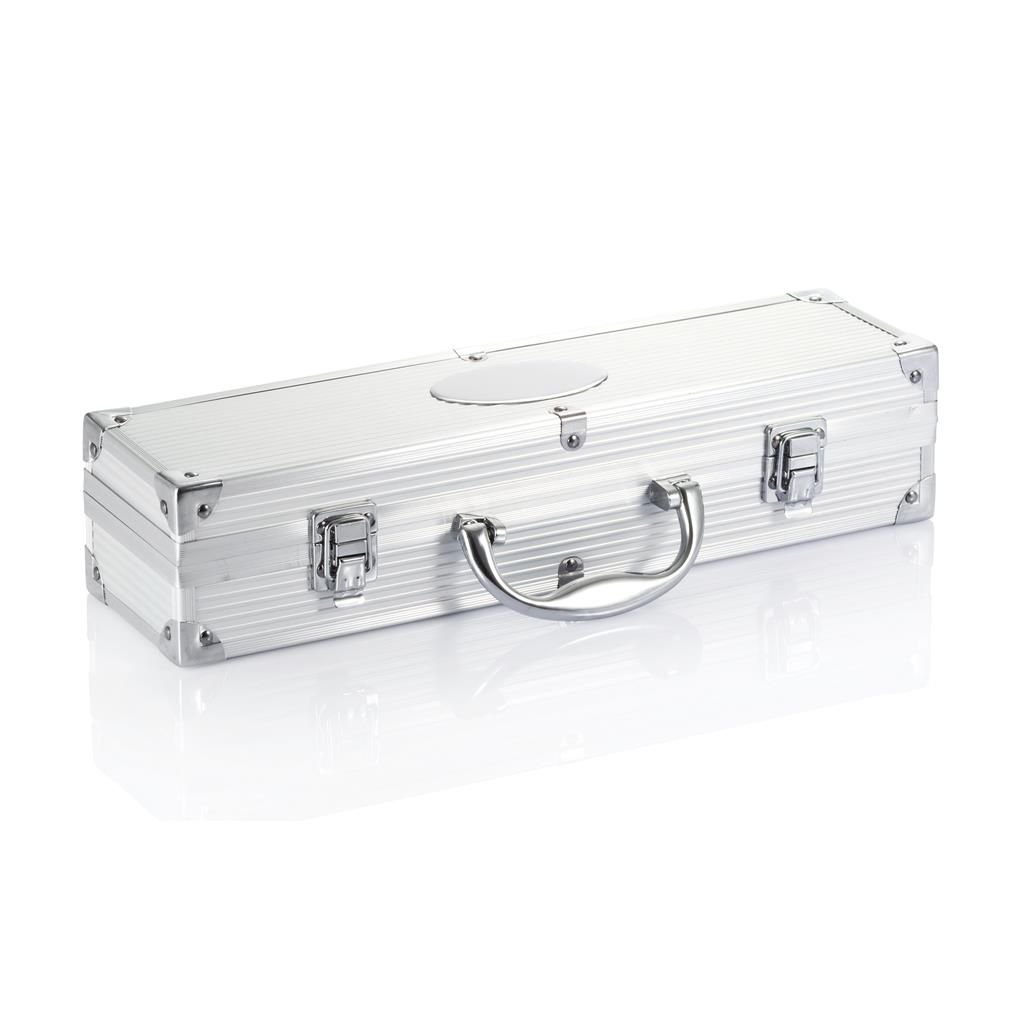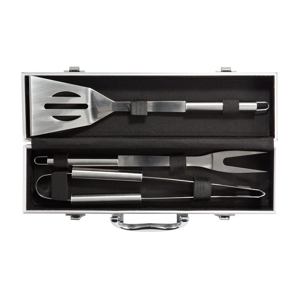Комплект за барбекю от неръждаема стомана от три части в алуминиево куфарче. Комплектът се състои от шпатула, вилица за нарязване и щипки, дръжки от неръждаема стомана.