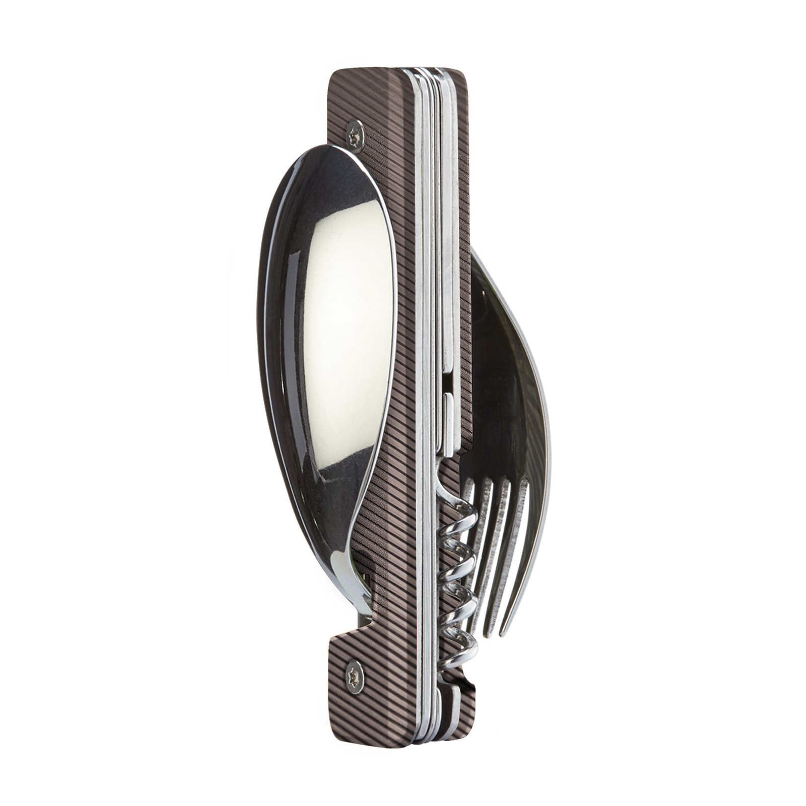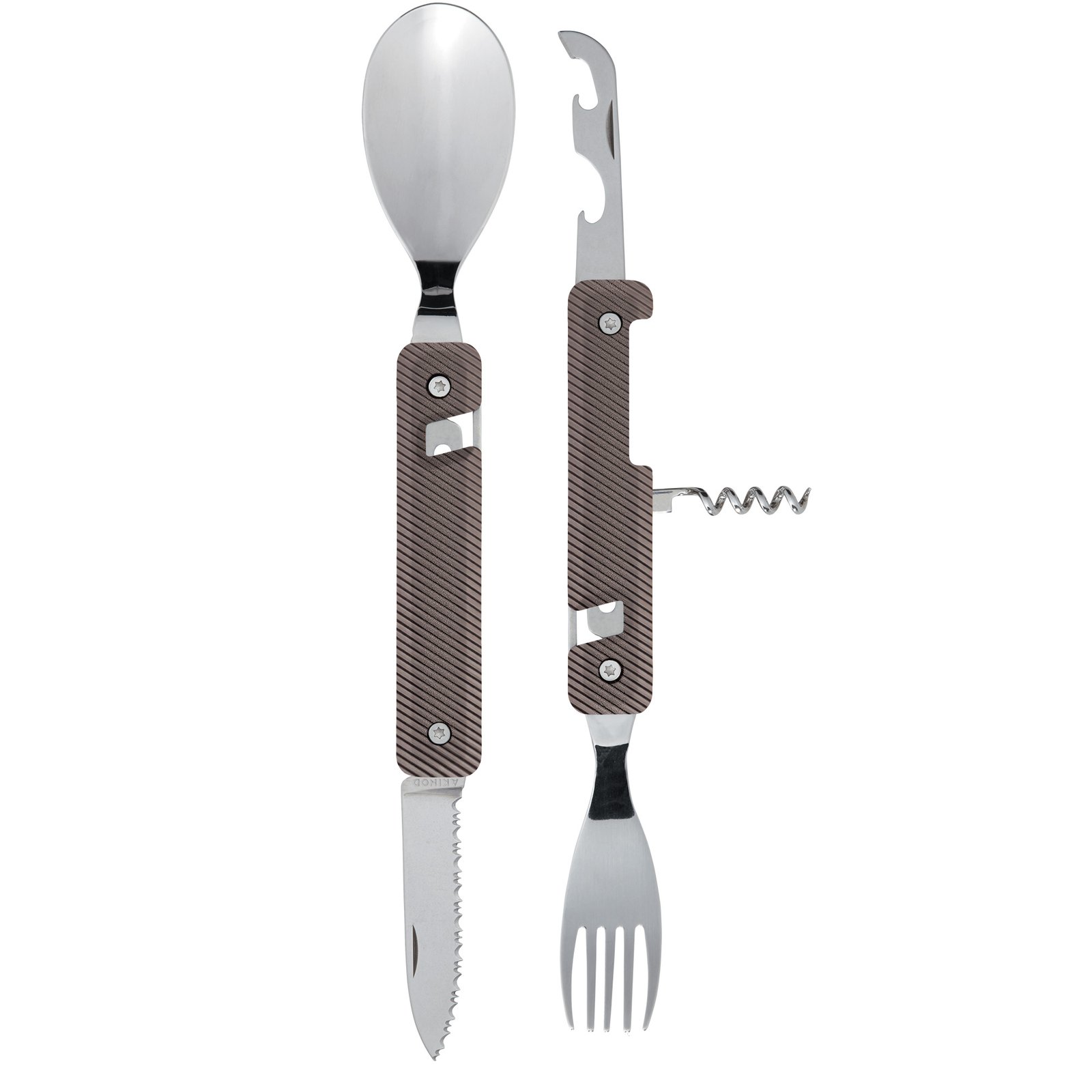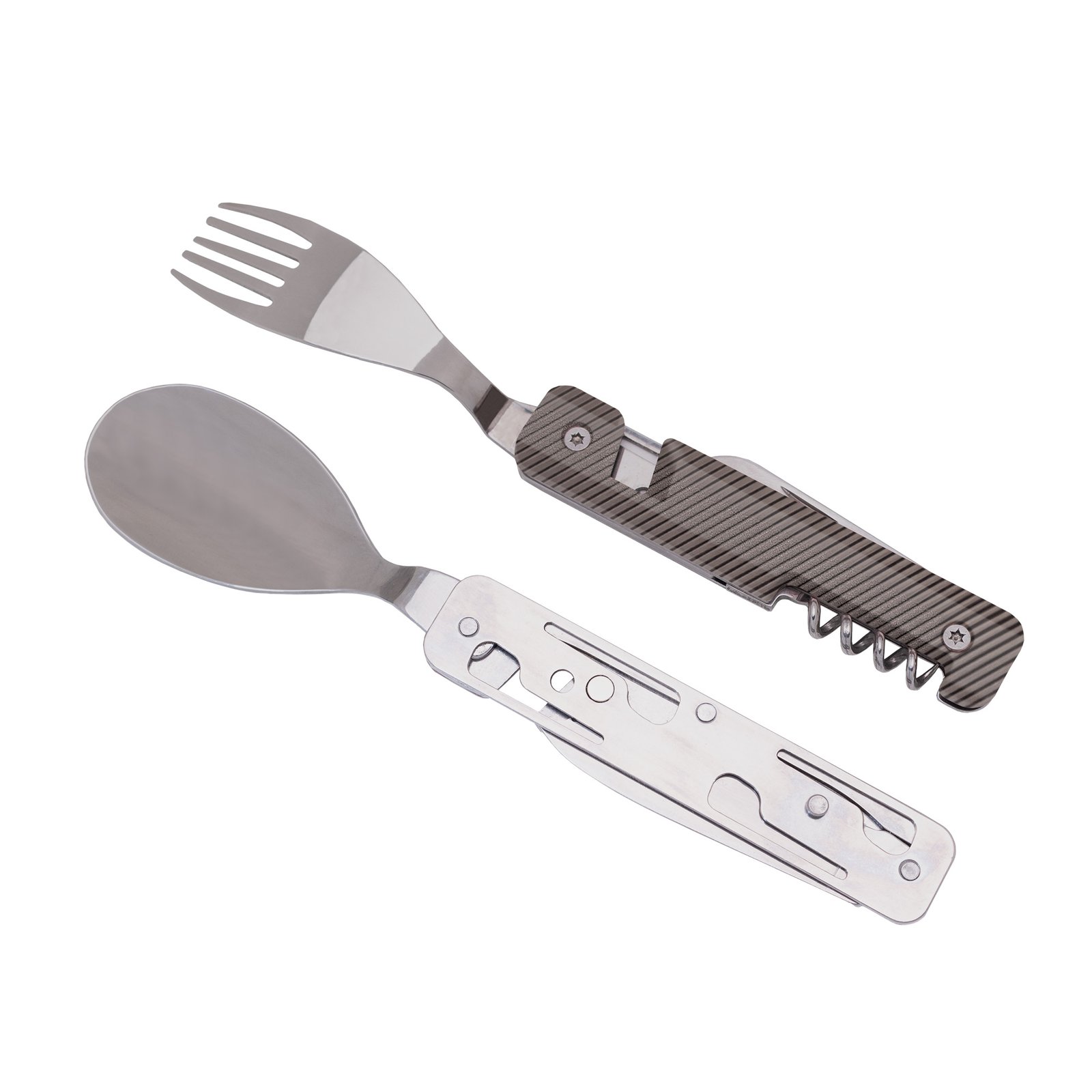 Този комплект мултифункционални прибори за хранене е изработен от висококачествена мартензитна неръждаема стомана 2CR14 с изключително полирано огледално покритие. Включва голяма лъжица, вилица с 5 зъба, нож с микронабраздено острие, тирбушон с 4 спирали, отварачка за консерви и отварачка за бутилки, които улесняват готвенето. Вземете сега на НЕВЕРОЯТНА цена от Portmoneta.bg