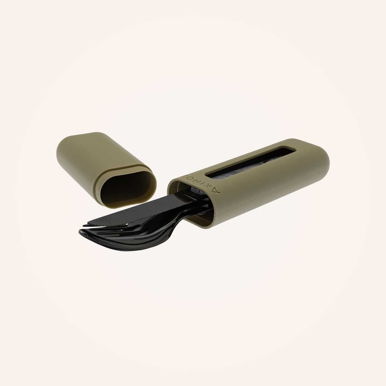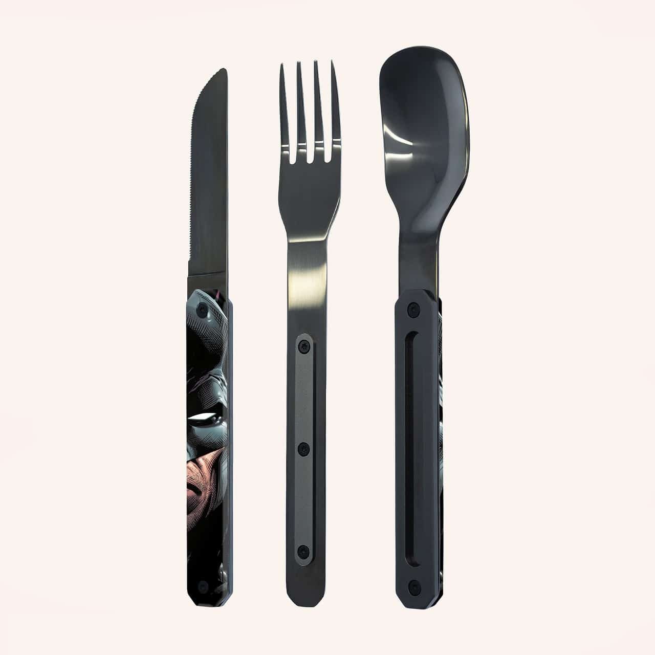 Прибори за хранене от мартензитна неръждаема стомана 2CR14, с полирано черно покритие. Състои се от голяма лъжица, вилица с 4 зъба и нож с микронабраздено острие. Декорирана прозрачна полимерна дръжка. Магнитен монтаж на приборите един към друг. Доставя се с твърд полипропиленов (PP) куфар за носене. Може да се мие в съдомиялна машина.