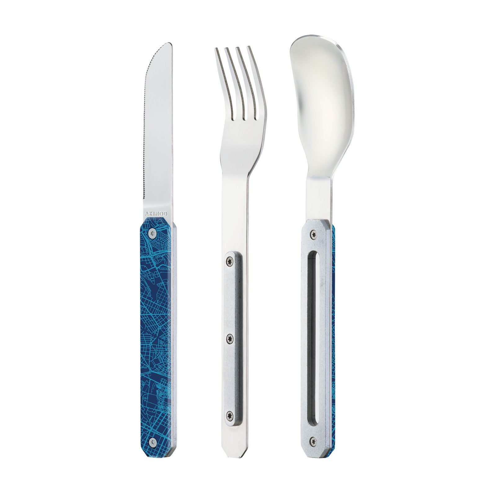 Комплект прибори за хранене от мартензитна неръждаема стомана 2CR14, с полирано огледално покритие. Тзои комплект разполага сСъстои голяма лъжица, вилица с 4 зъба и нож с назъбено остриео острие. Дръжката е изработена в син десен, който прави комплекта супер красив и дизайнерски. Приборите разполагат също така с уникалне магнитен монтаж. Закрепват се в комплект с едно единствено движение.