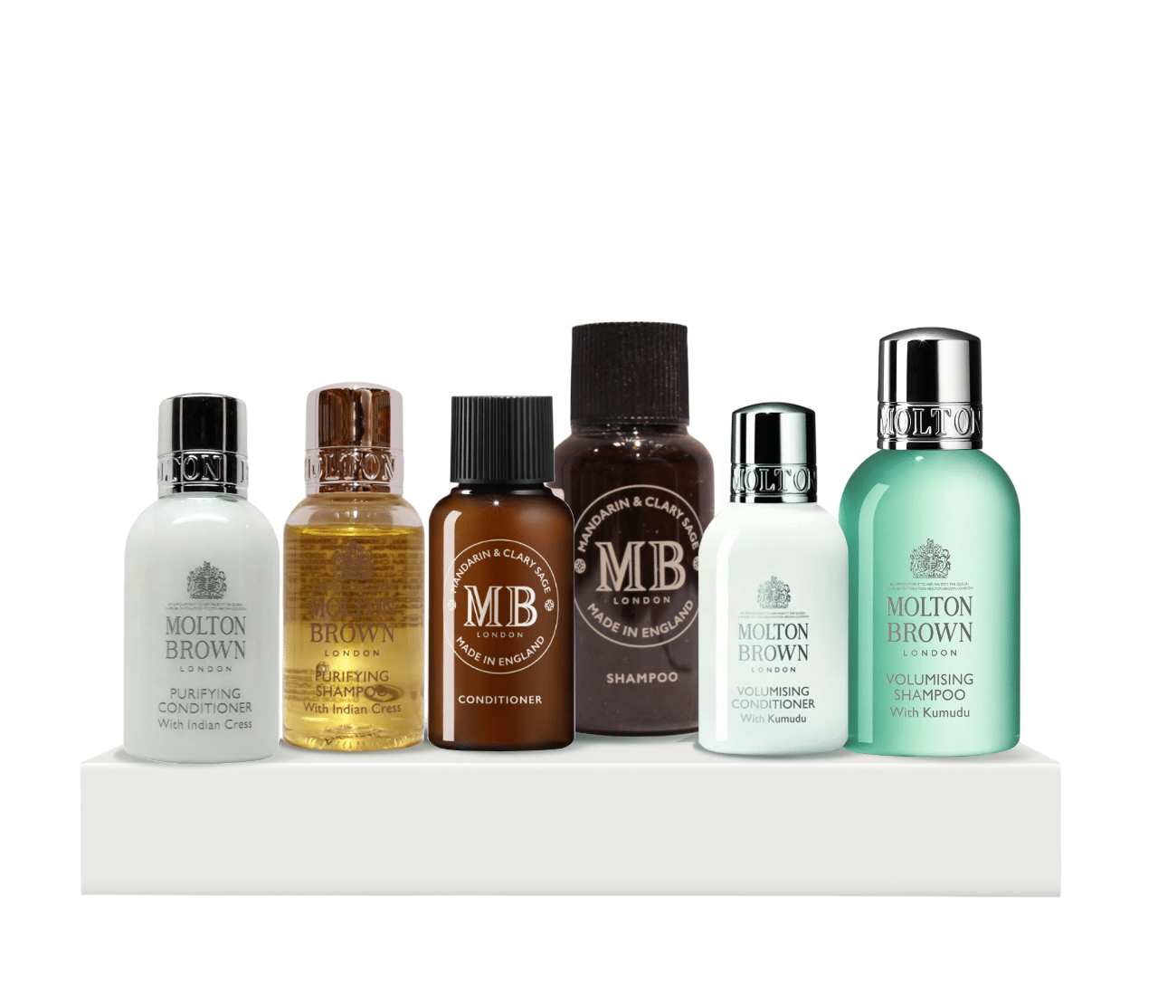 Комплект за откриване на коса Molton Brown: Индийски кресон шампоан за коса за почистване 30 мл + Индийски кресон балсам за коса за почистване 30 мл + Мандарина и градински чай балсам за коса за възстановяване 30 мл + Molton Brown кумуду шампоан за коса за обем 50 мл + Molton Brown кумуду балсам за коса за обем 30 мл + Мандарина и градински чай шампоан за коса за обем 30 мл