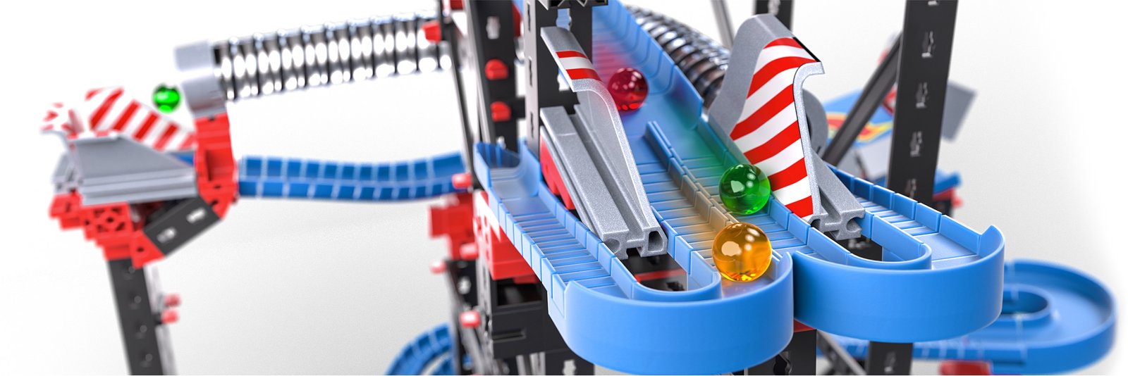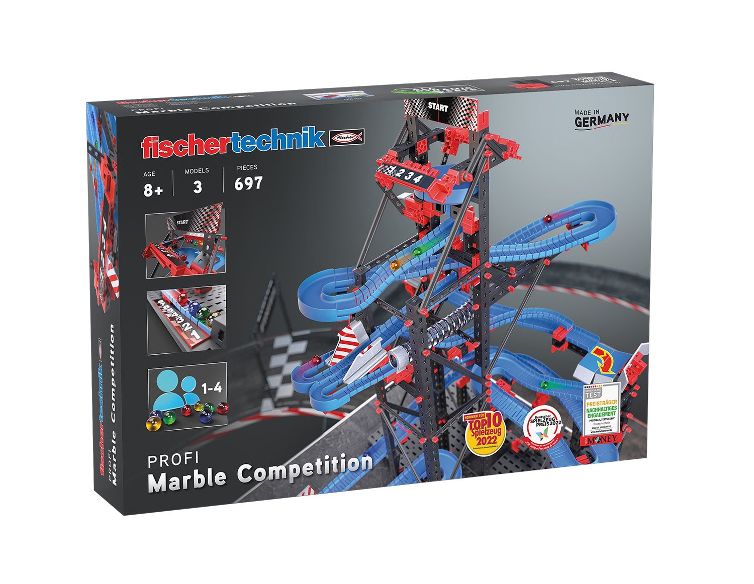 Представяйки ви Marble Competition на fischertechnik, предлагаме неповторимо преживяване за единични играчи, групи приятели или цели отбори, които търсят часове на интригуващо и вълнуващо забавление! Този строителен комплект е пълен с вълнуващи модели на състезателни писти, които ще ви отведат в света на активна игра и конкуренция. Включени са три напълно различни модела, всеки един изпълнен с екшън и възможности за изключителни състезателни изживявания.