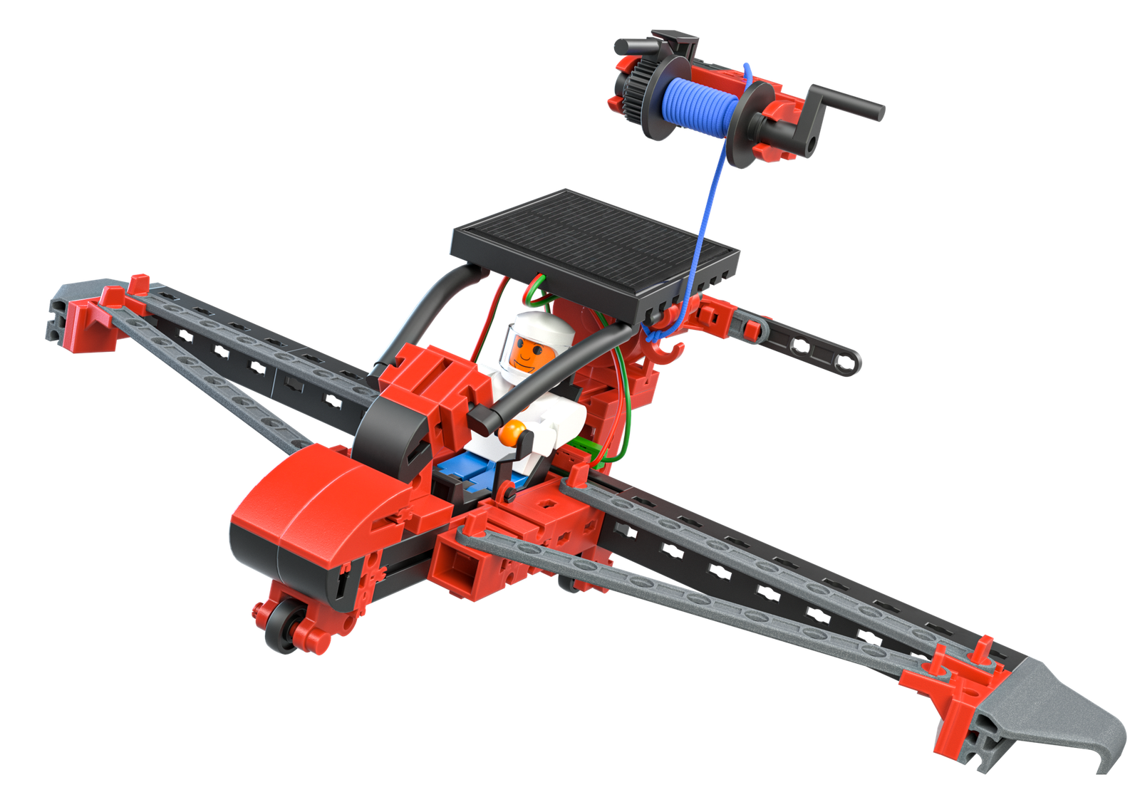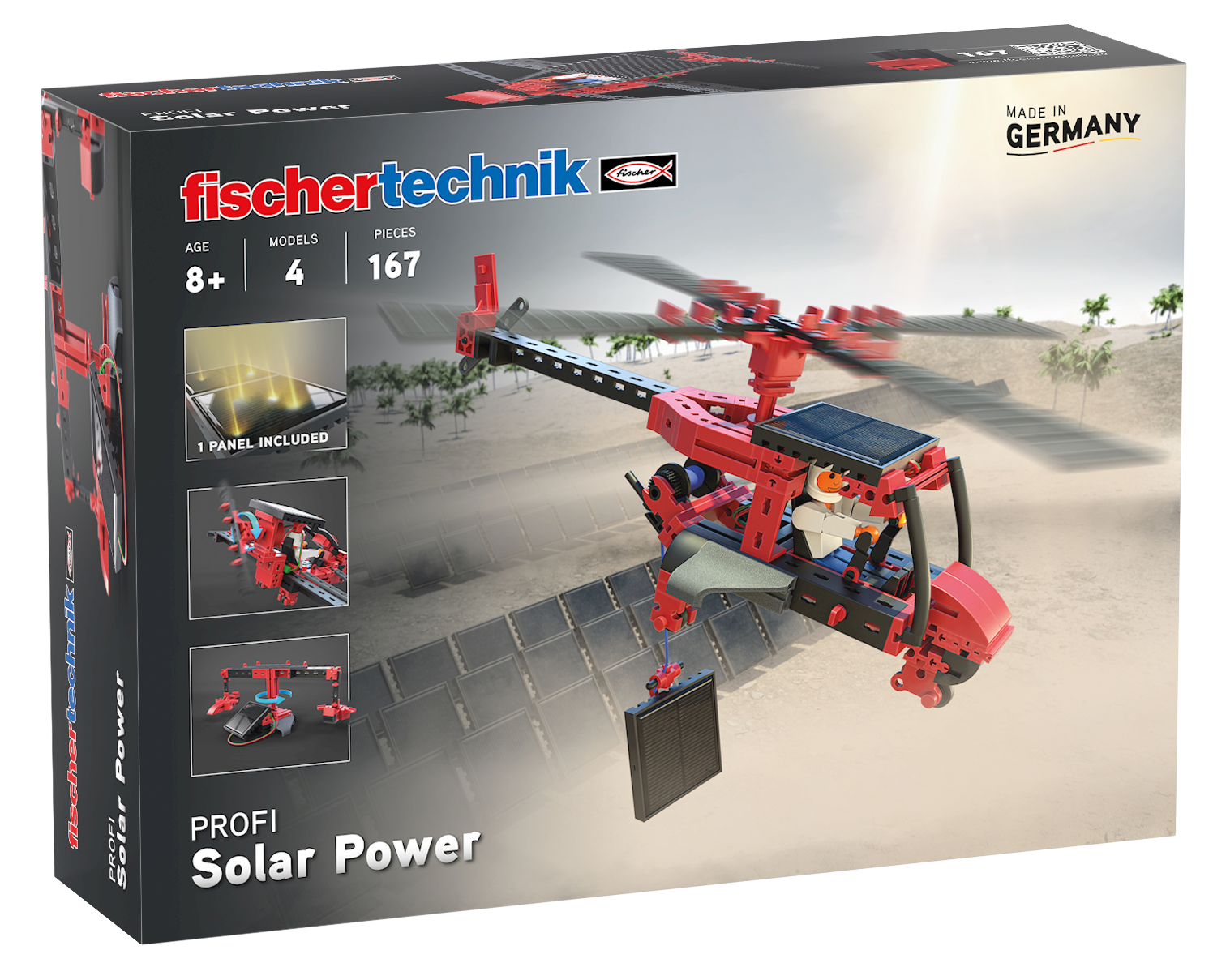 Например, новият соларен конструктор "Слънчева енергия" на fischertechnik предлага множество различни модели, които обещават забавление и разнообразие в процеса на изследване на силата на слънцето. Когато облаците изчезнат и слънцето просветне, децата имат възможност да изследват въздушното пространство със самолети и хеликоптери. Вятърната мелница и въртележката също се въртят с максимална скорост при слънчево време, предоставяйки още един начин за въвеждане в темата за възобновяемата енергия.