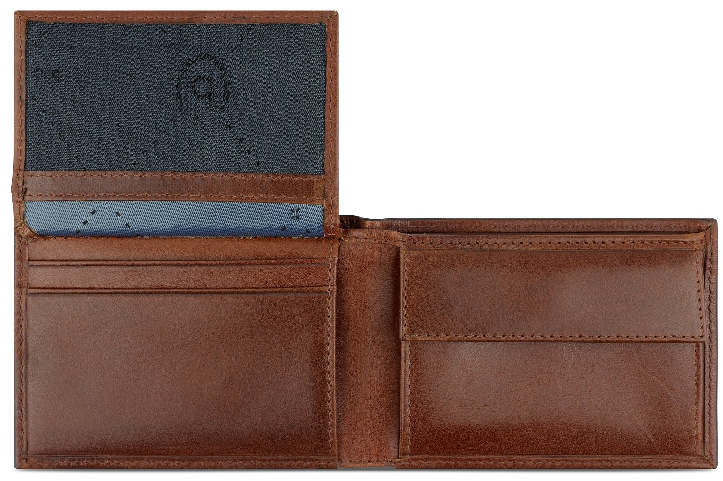 - Лого на марката Bugatti, щамповано в кожата в предната част на портфейла