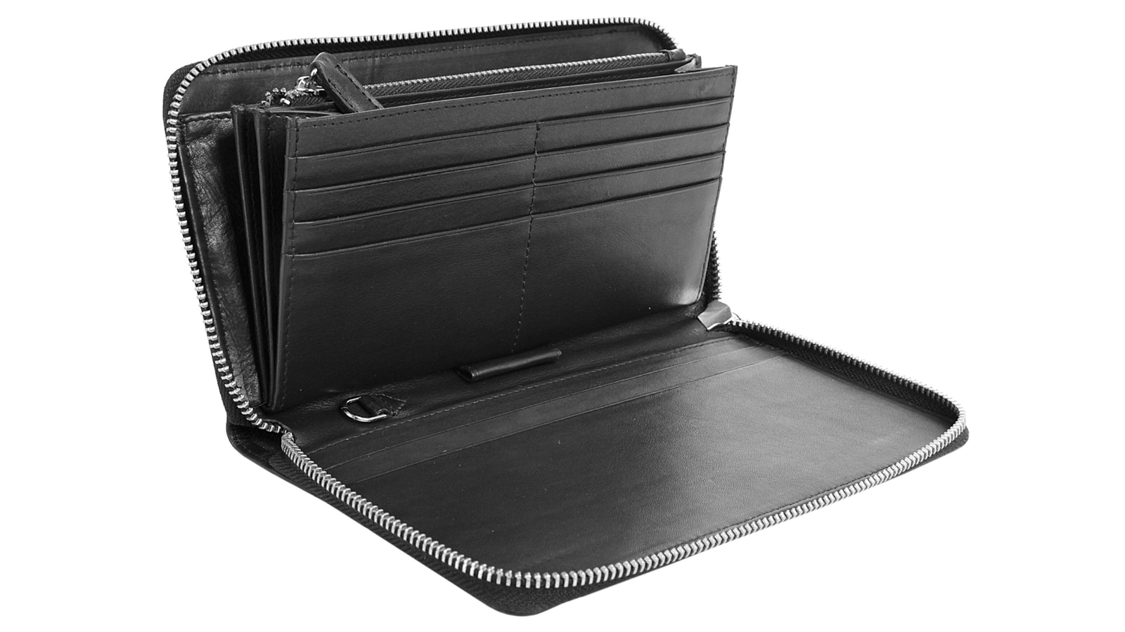 Кожен портфейл със спортно-елегантна визия от колекцията на Bugatti - Atlanta. По цялата външна част на портфейла има цип. Разполага с джоб за монети с цип, отделение за банкноти, шестнадесет отделения  за кредитни карти и други пластики, четири допълнителни джоба, място за химикалка, каишка за ръка. Стилно и удобно решение за изискани дами.