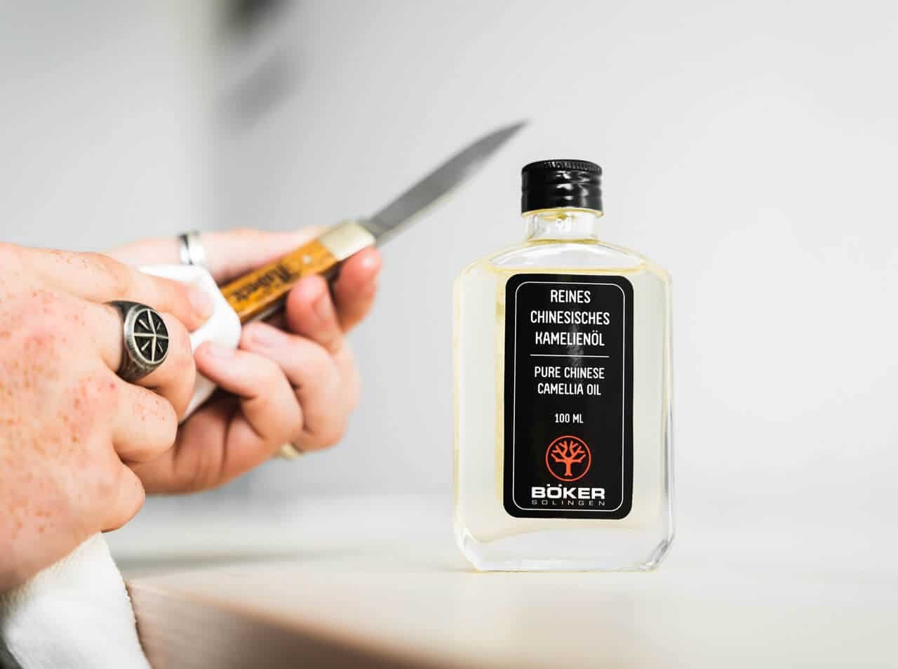 Висококачественото, чисто Boker Camellia Oil е произведено по традиционна китайска рецепта и има много приложения. Рядкото масло се извлича от семената на дървото камелия, неутрално е на вкус, без мирис и не изсъхва. Маслото от камелия е безопасно за храните и впечатлява със своята особена чистота. Защита от корозия: Несъдържащото киселини, смолисто и неизпаряващо се масло от камелия традиционно се използва за защита от корозия при грижата за висококачествени остриета на ножове, изработени от въглеродна стомана, както и инструменти и оръжия.
