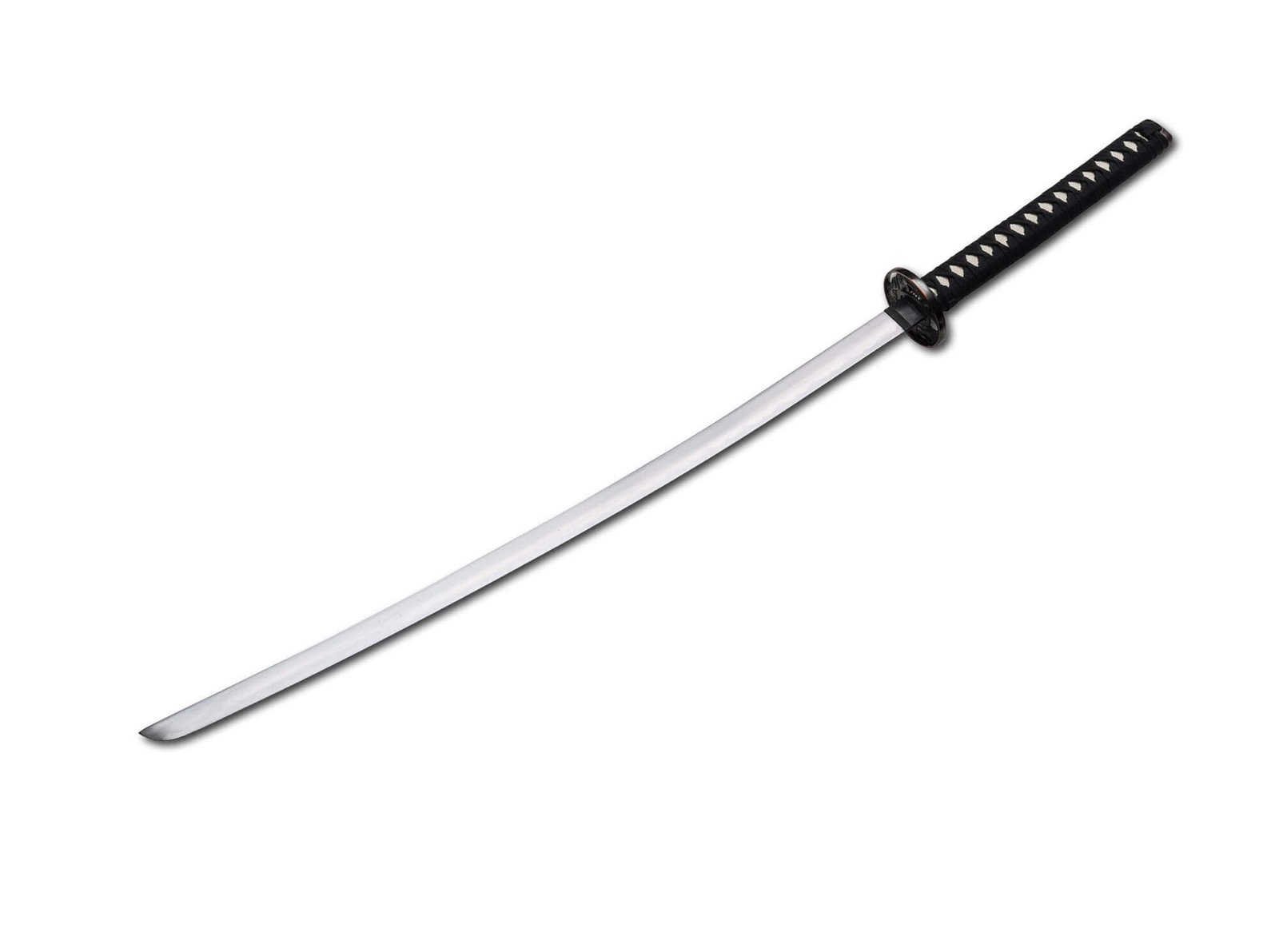 Една от новостите в нашето портфолио от мечове е с декоративно шлифовано острие от въглеродна стомана (не от неръждаема) и традиционна цуба. На предпазителя за ръката е изобразен летящ дракон. Традиционната ръкохватка има подплата, изработена от имитация на кожа на скат и типичната за ръкохватка обвивка. Линията на закаляване (Hamon) е нанесена изкуствено. Черна дървена ножница с дракон в лилав цвят.