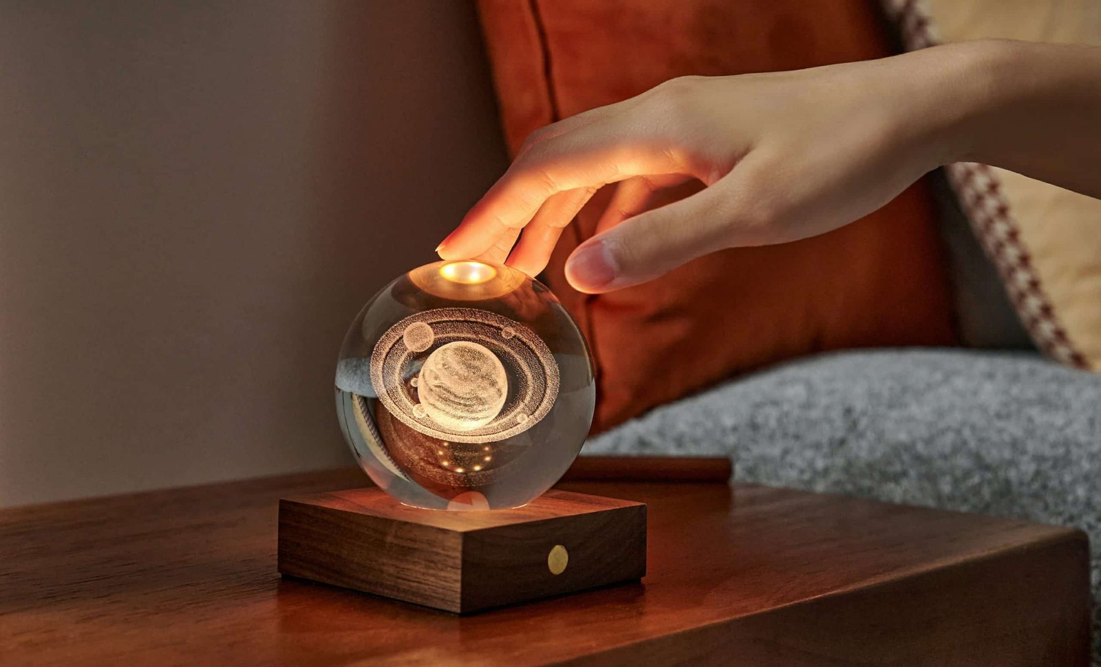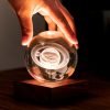 С височина 12 см кристалната топка е разположена върху основа от естествено орехово дърво, за да допълни интериорния ви дизайн. Можете да превключвате между три нива на интензивност на светлината, като докоснете медния бутон отпред на основата от масивна естествена дървесина. Кристалът също е полиран до блясък, който отразява светлината и създава зашеметяващ ефект във всяка стая. Основата от орех е снабдена с акумулаторна батерия, която може да поддържа пространството ви осветено със зашеметяваща светлина до 16 часа. USB-C портът в задната част позволява лесно зареждане.