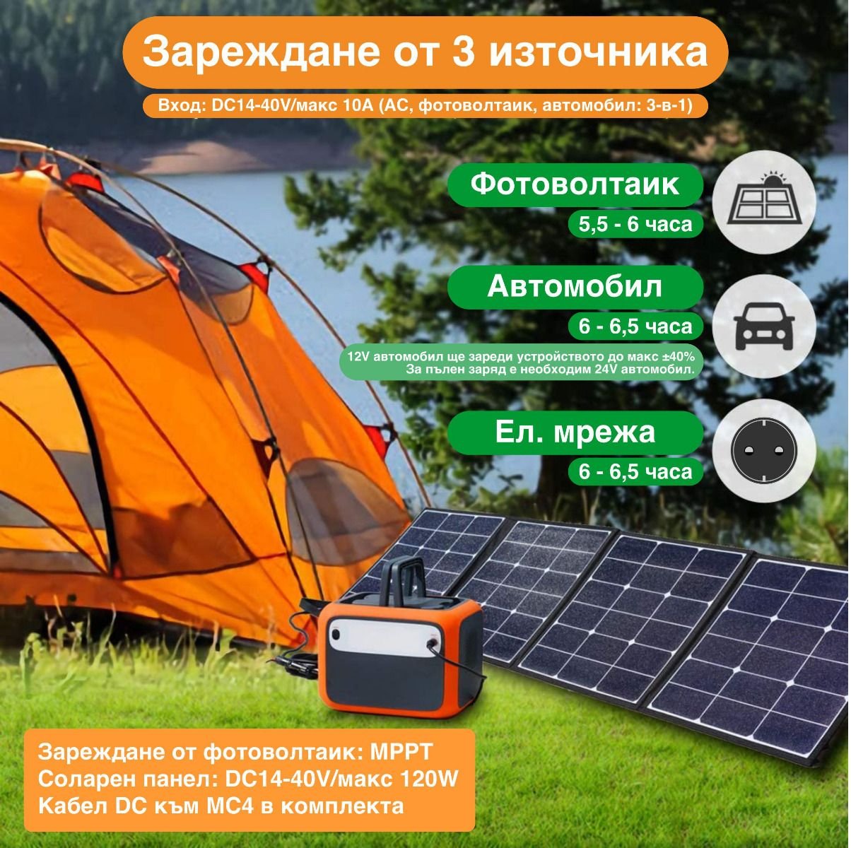 | PV соларен панел (MPPT) | 120W(Input voltage range:14-40V), време за зареждане:5-6часа |