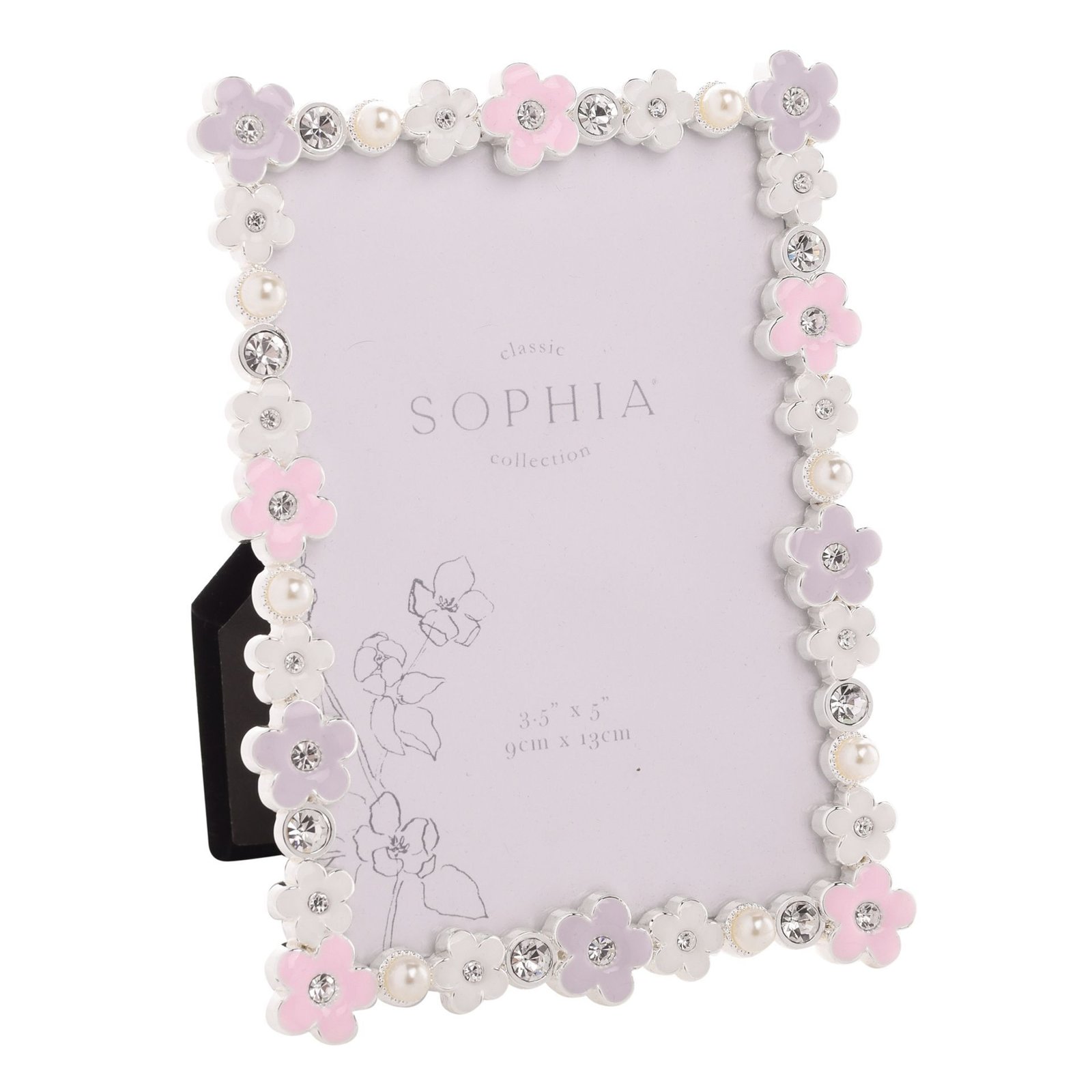 Представяме ви рамката Sophia Classic Daisy 3.5" x 5" - Pastel, възхитително очарователно изделие, което се съчетава перфектно със скъпоценни спомени. Украсена с нежни бели и розови цветя, тя е наслада за очите, а блестящите кристали добавят блясък.