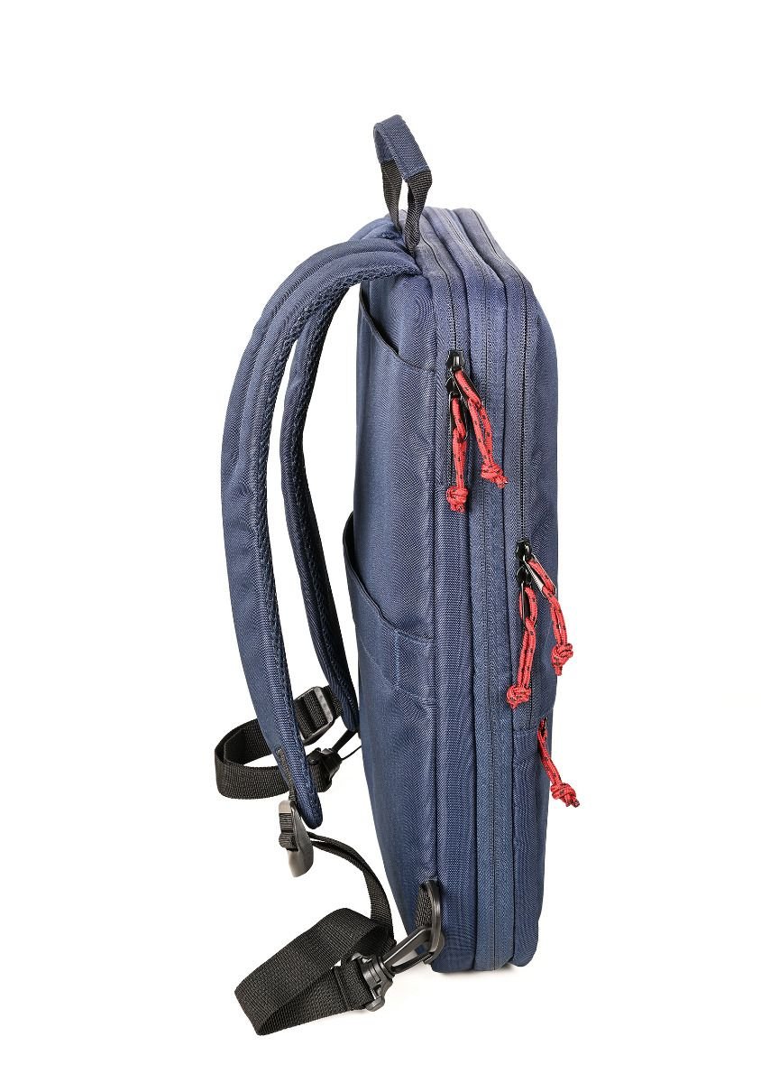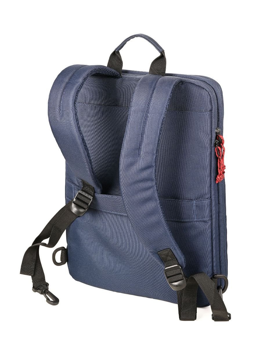 Раница за лаптоп, изработена от 100% рециклиран PET (rPET) материал (сертифициран съгласно Global Recycled Standard), разширяваща се чрез допълнителен цип, с 2 големи отделения (подплатено отделение за лаптоп и основно отделение) с двупосочно затваряне с цип, за лаптоп (до 16''), няколко вътрешни джоба, 2 предни отделения + разширени 2 мрежести джоба за бутилка и чадър, подсилена основа, примка за закрепване към количка, скрити презрамки за раница, капацитет с възможност за разширяване от приблизително 6 литра до приблизително 14 литра, 100% rPET полиестер, rPET, син.