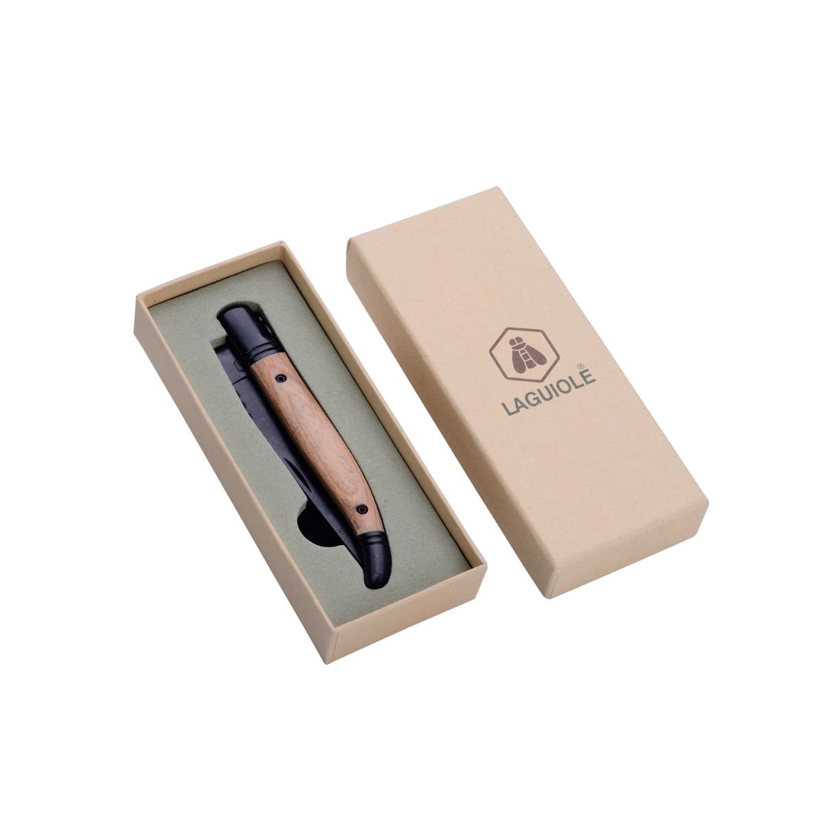 Сгъваем туристически нож Laguiole. Чирените на ножа са изработени от няколко слоя импрегнирани дървесни фурнири(Pakkawood). Ножът се предлага в подаръчна кутия, изработена от рециклирани материали.