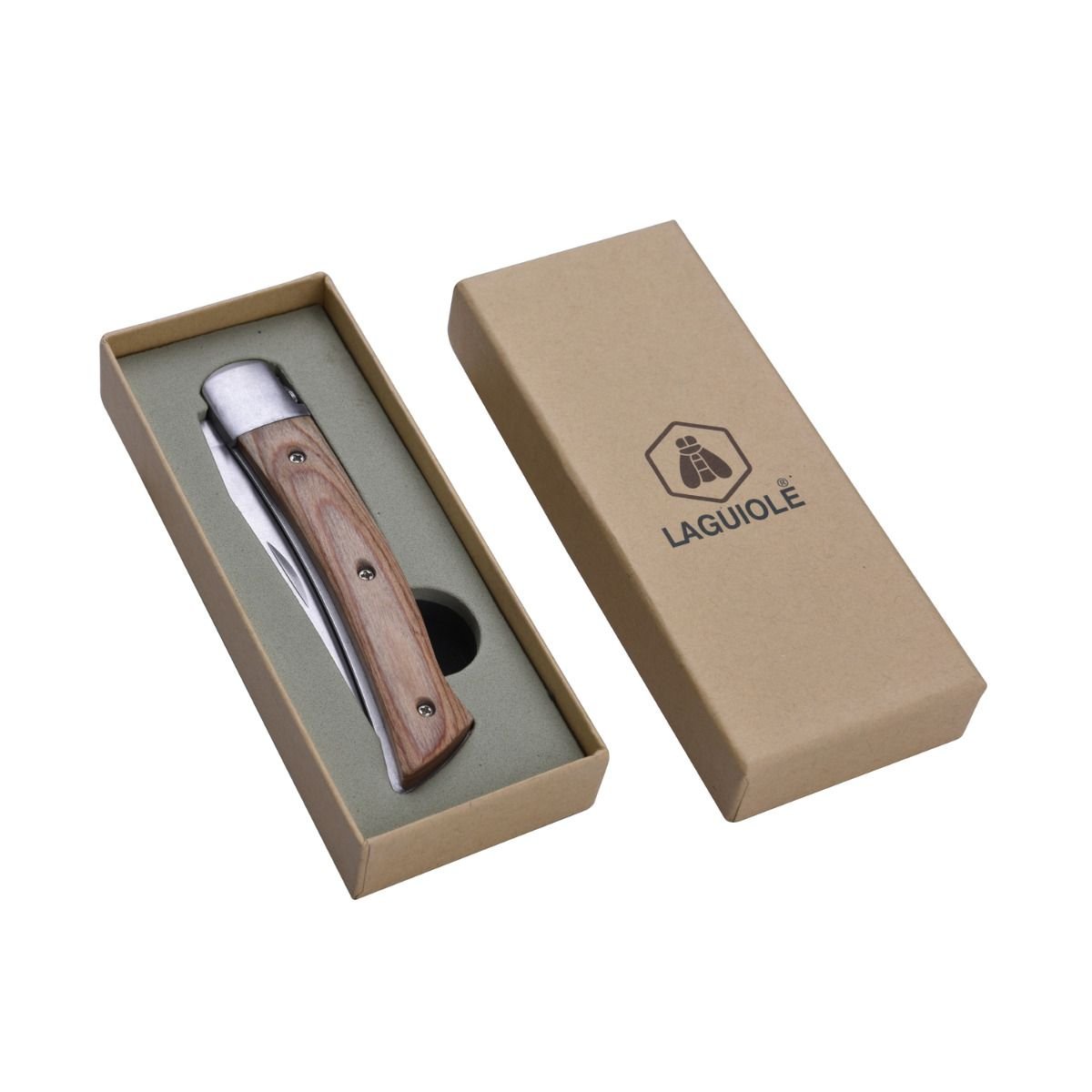 Сгъваем туристически нож Laguiole. Чирените на ножа са изработени от няколко слоя импрегнирани дървесни фурнири(Pakkawood). Ножът се предлага в подаръчна кутия, изработена от рециклирани материали.